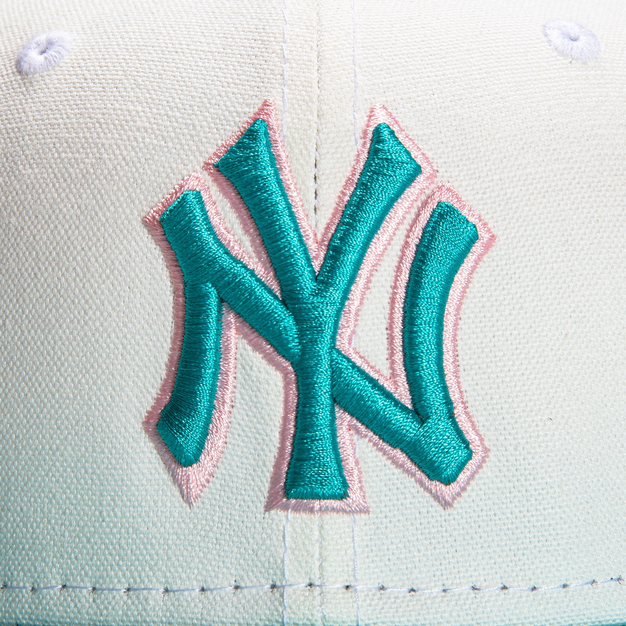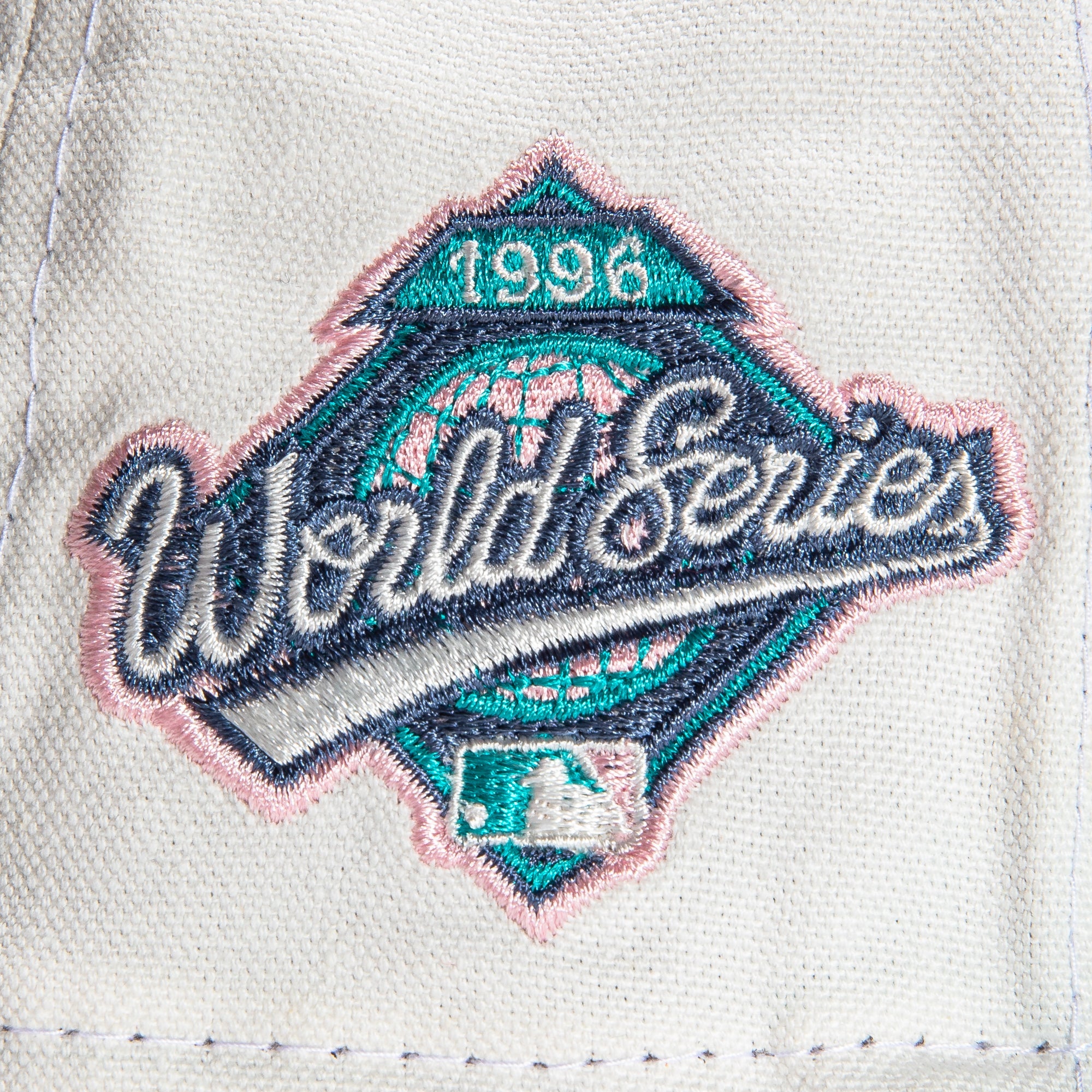 This New Era Monaco New York Yankees 1996 World Series 59FIFTY Fitted Hat is a Hat Club exclusive. The fitted has a stone six panel structured high crown and embroidered eyelets with a teal fabric squatchee button. The fitted cap also has a teal flat bill with a pink satin undervisor. The front panel features the New York Yankees logo embroidery and a 1996 World Series side patch embroidery on the right panel. The left panel of the fitted displays the New Era logo and the official MLB logo embroidery on the rear crown.