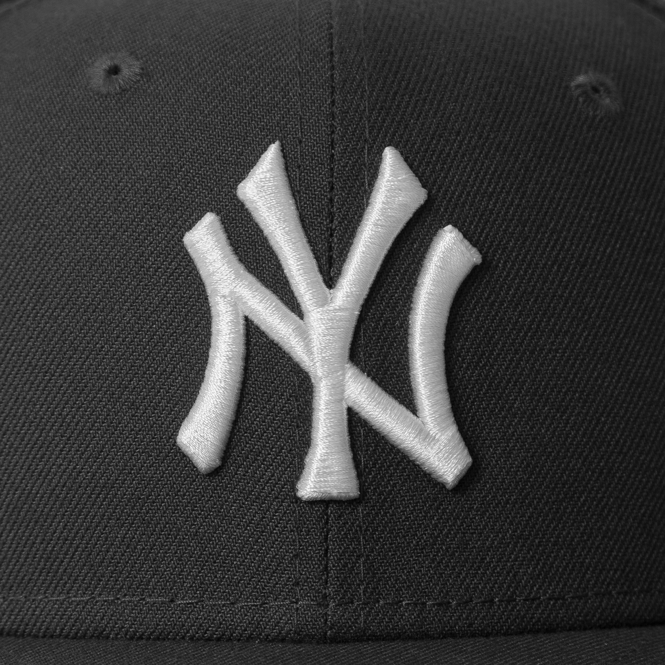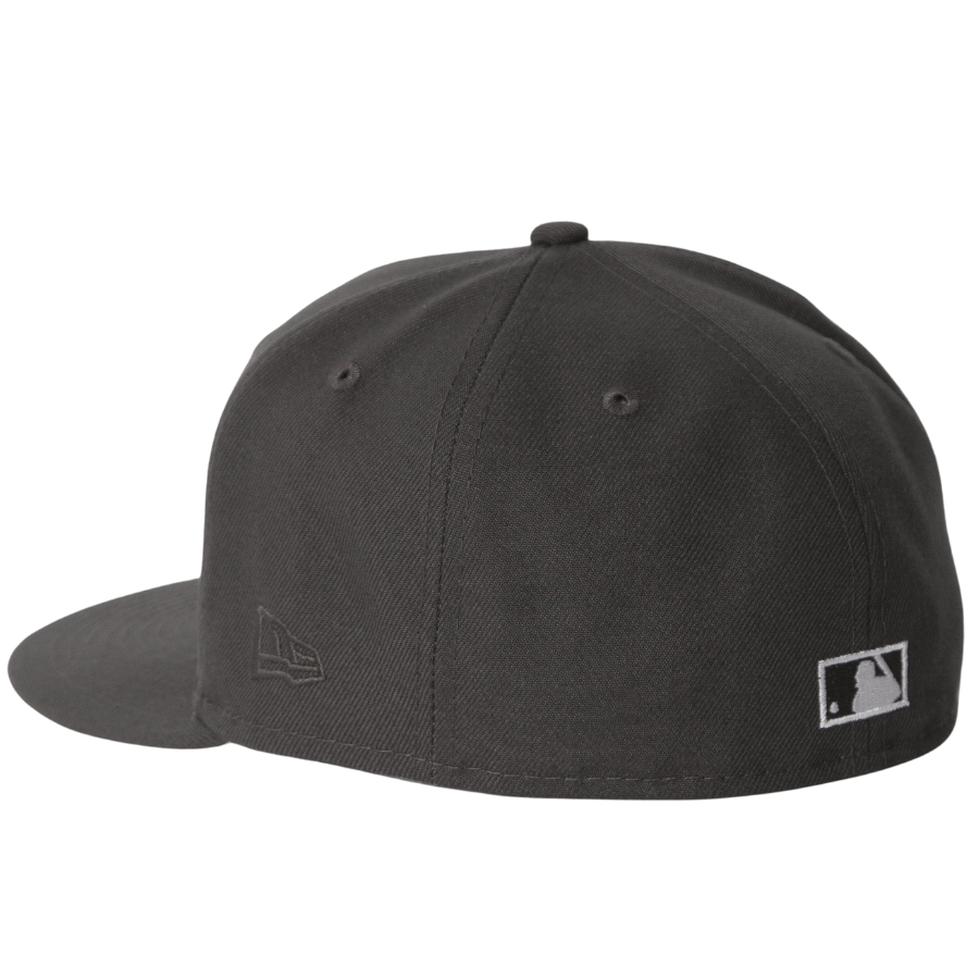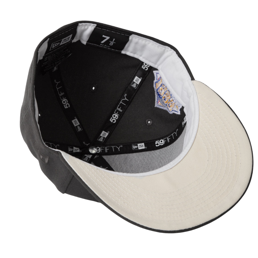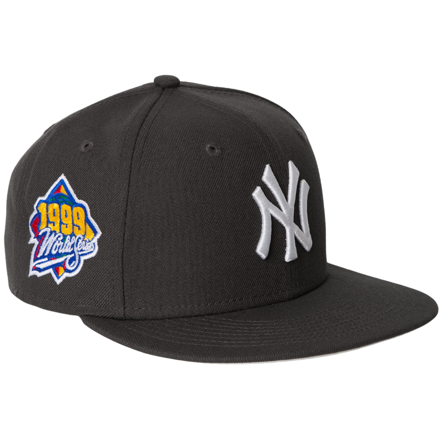This New York Yankees fitted hat was released by Nohble. The fitted has a pewter black six panel structured high crown and embroidered eyelets, a pewter black fabric squatchee button and flat bill with a white undervisor and white sweatband. The front panel features a white stitched New York Yankees logo embroidery and a 1999 World Series side patch on the right panel. The left panel of the fitted displays the New Era "Fly Your Own Flag" logo and the official MLB Batterman embroidery on the rear crown.