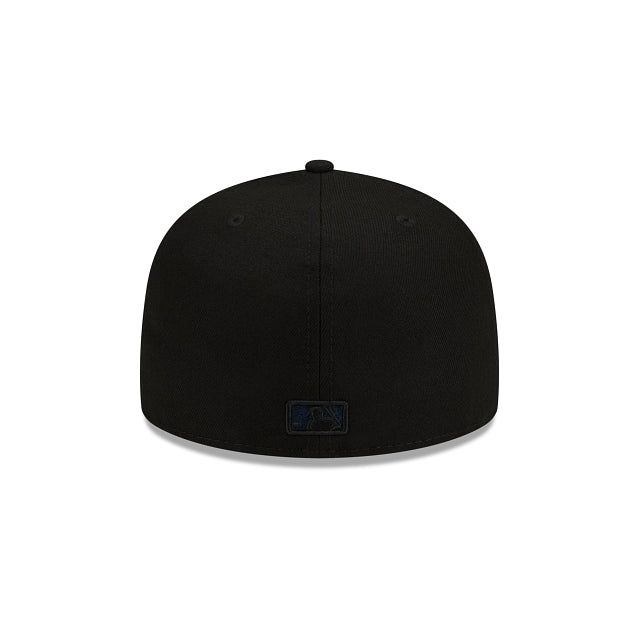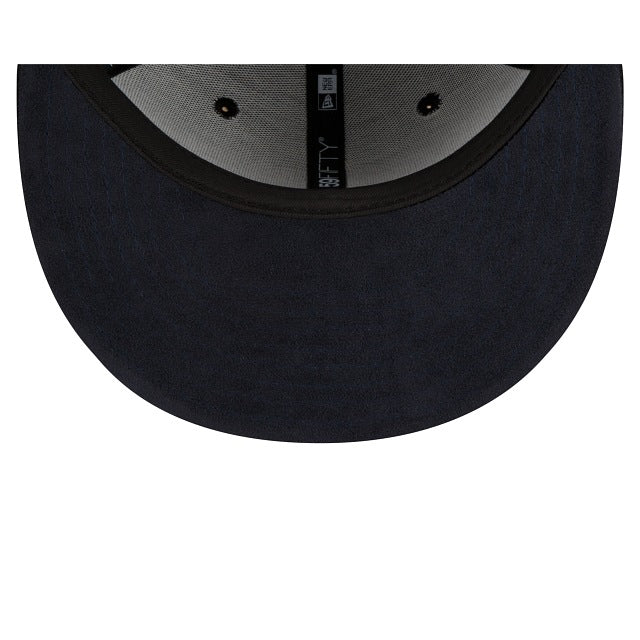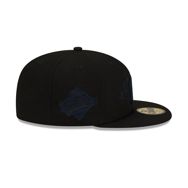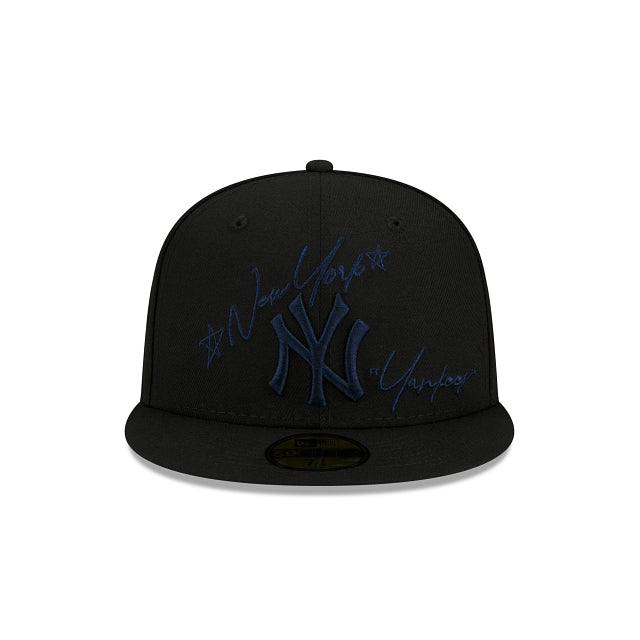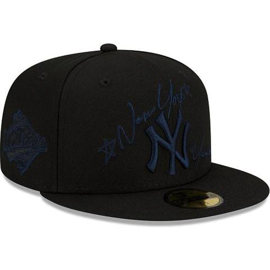 The New York Yankees Cursive 59FIFTY Fitted Cap features an embroidered Yankees logo with a matching cursive script at the front panels, a World Series patch embroidered at the right-wear side and the MLB Batterman logo at the rear. Additional details include a gray undervisor.