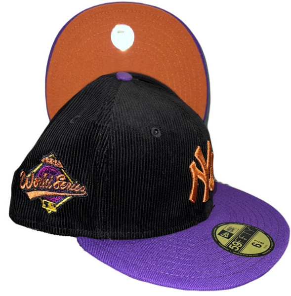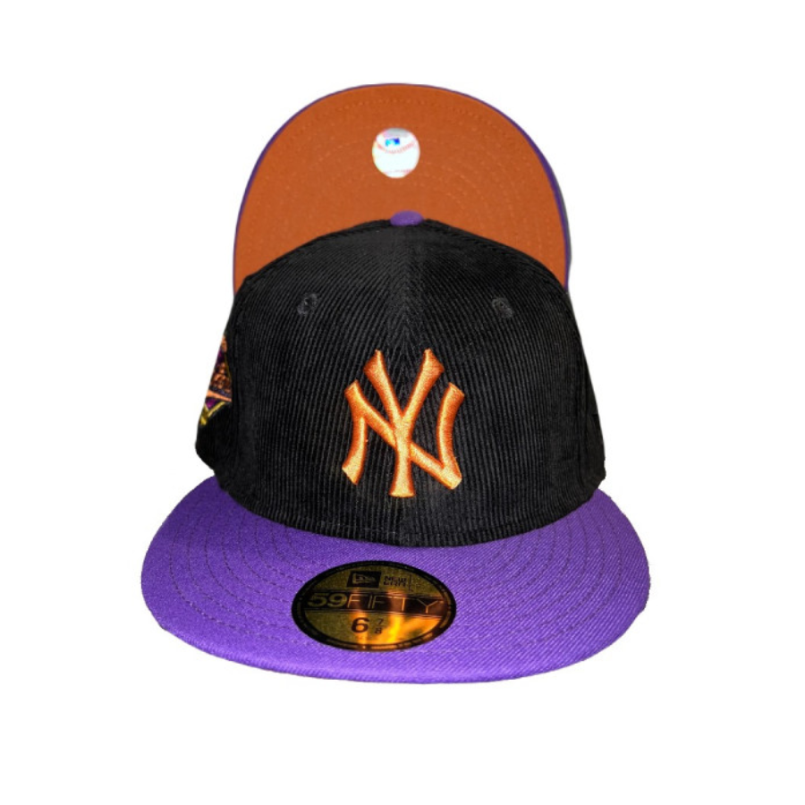 This New Era New York Yankees "Five Mic Pack" Black Corduroy 1996 World Series 59FIFTY Fitted Hat was dropped by Pro Image Sports. The fitted has a black corduroy six panel structured high crown and embroidered eyelets with a grape purple fabric squatchee button. The fitted cap also has a grape purple flat bill with a colored undervisor. The front panel features the New York Yankees logo embroidery and a side patch embroidery on the right panel. The left panel of the fitted displays the New Era logo and the official MLB logo embroidery on the rear crown.