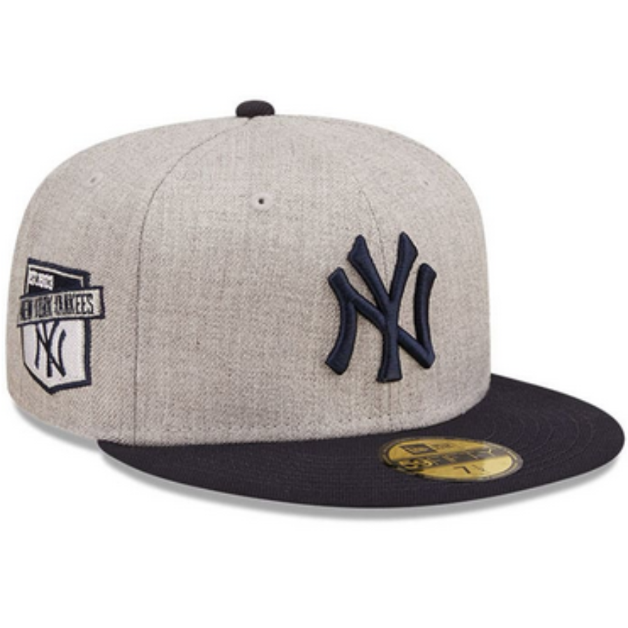 This New York Yankees Heather Grey fitted hat has a six panel structure high crown, embroidered eyelets, fabric squatchee button, flat bill and a side patch on the right-wear side.