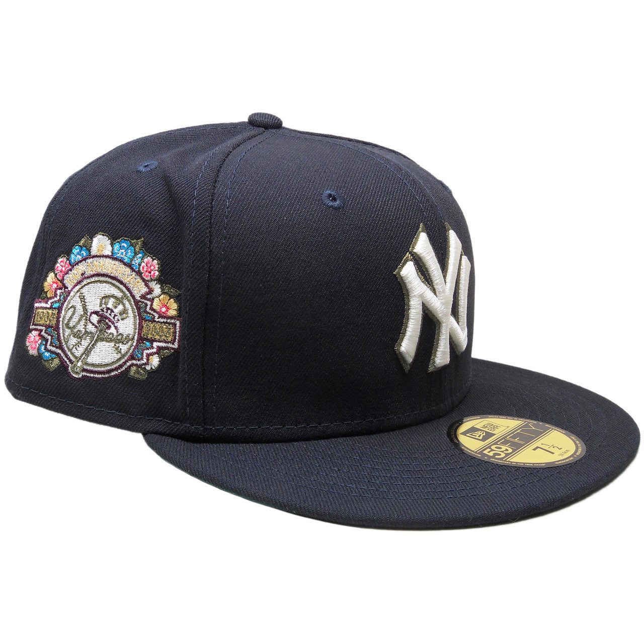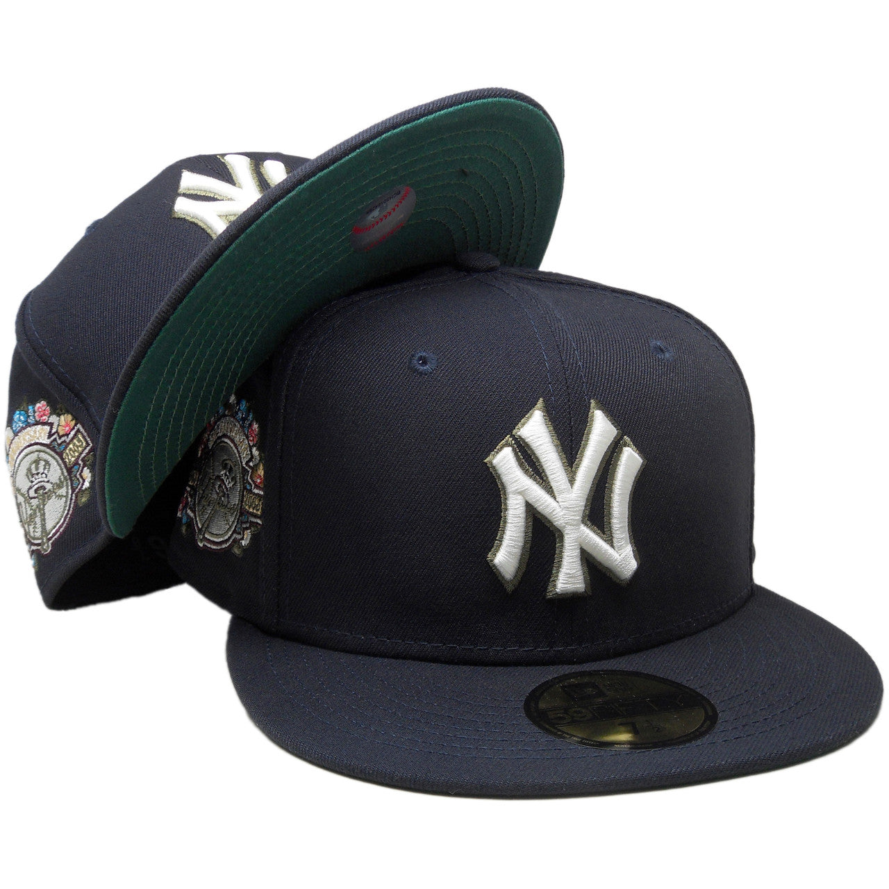 This New York Yankees fitted hat has a navy blue six panel structured high crown, embroidered eyelets and fabric squatchee button. The fitted cap also has a navy blue flat bill with a green undervisor and black sweatband. The front panel features the NY Yankees logo embroidery and a botanical anniversary side patch embroidery on the right panel. The left panel of the fitted displays the New Era logo and the official MLB Batterman logo embroidery on the rear crown.