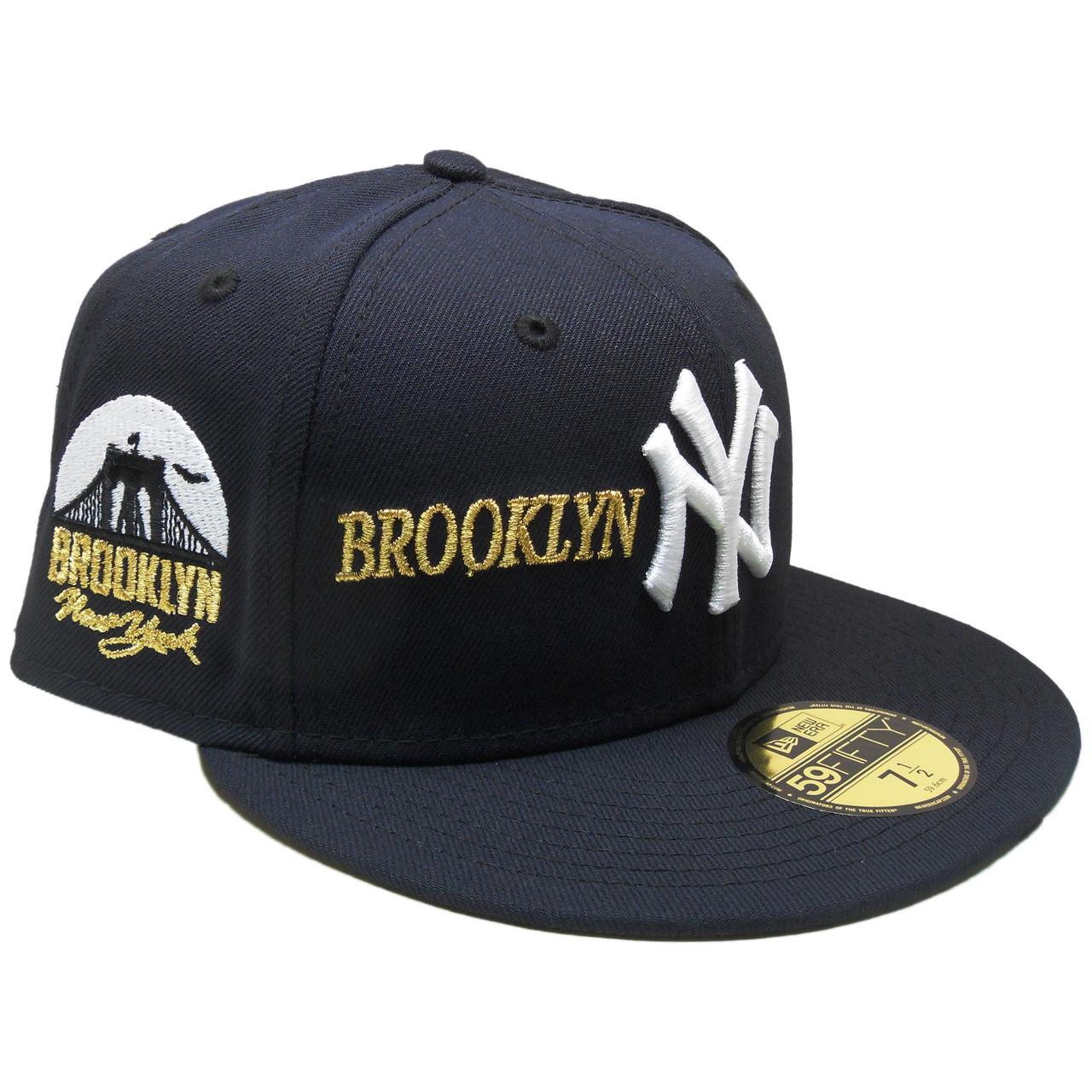 This New Era New York Yankees Navy, Gold & White "Brooklyn" 59FIFTY Fitted Hat has a navy blue six panel structured high crown and embroidered eyelets with a navy blue fabric squatchee button. The fitted cap has a navy blue flat bill with a gold undervisor. The front panel features the New York Yankee logo embroidery in white and "Brooklyn" script in gold. A Brooklyn Bridge side patch embroidery is featured on the right panel. The left panel of the fitted displays the New Era logo and the official MLB logo embroidery on the rear crown.
