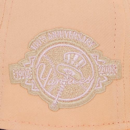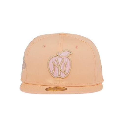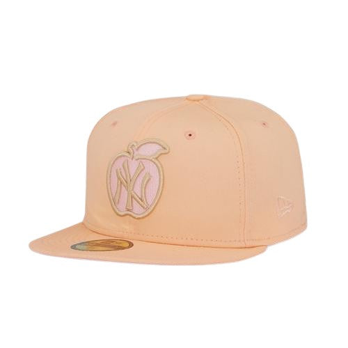 This New Era New York Yankees 'Peaches & Cream' 59FIFTY fitted hat has a a peach six panel structured high crown, embroidered eyelets and fabric squatchee button. The flat bill of the fitted cap is peach with a soft pink undervsior. The front panel features the New York Yankees logo embroidery with a side patch embroidery on the right panel.