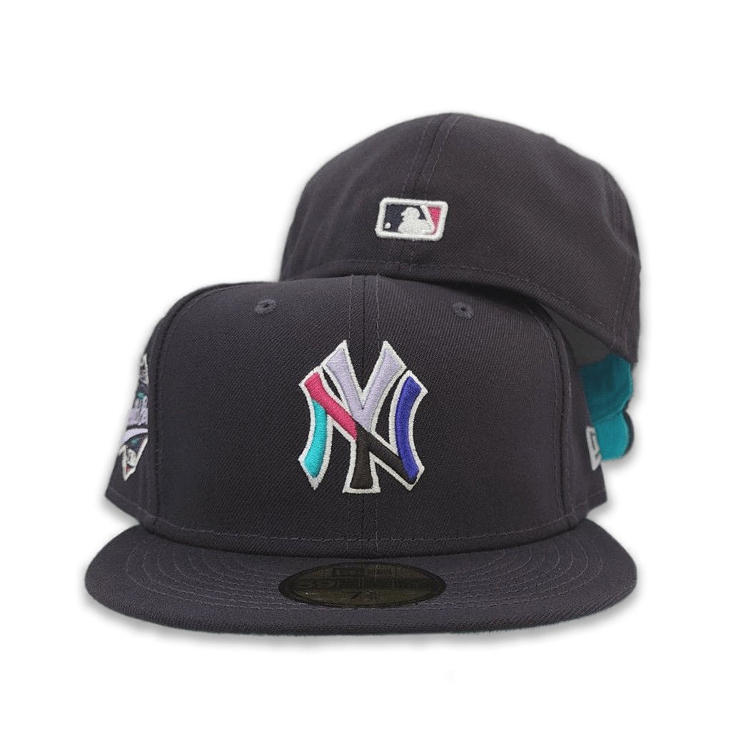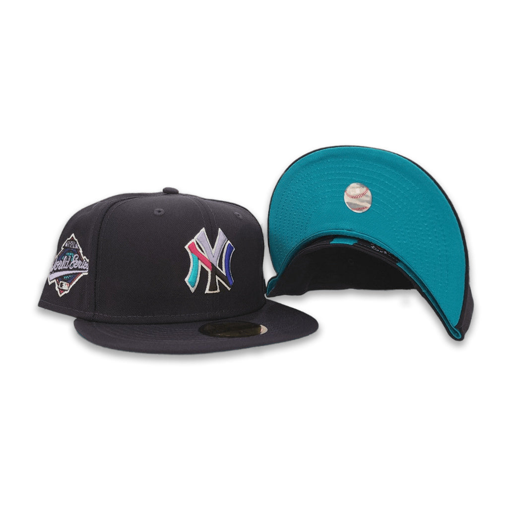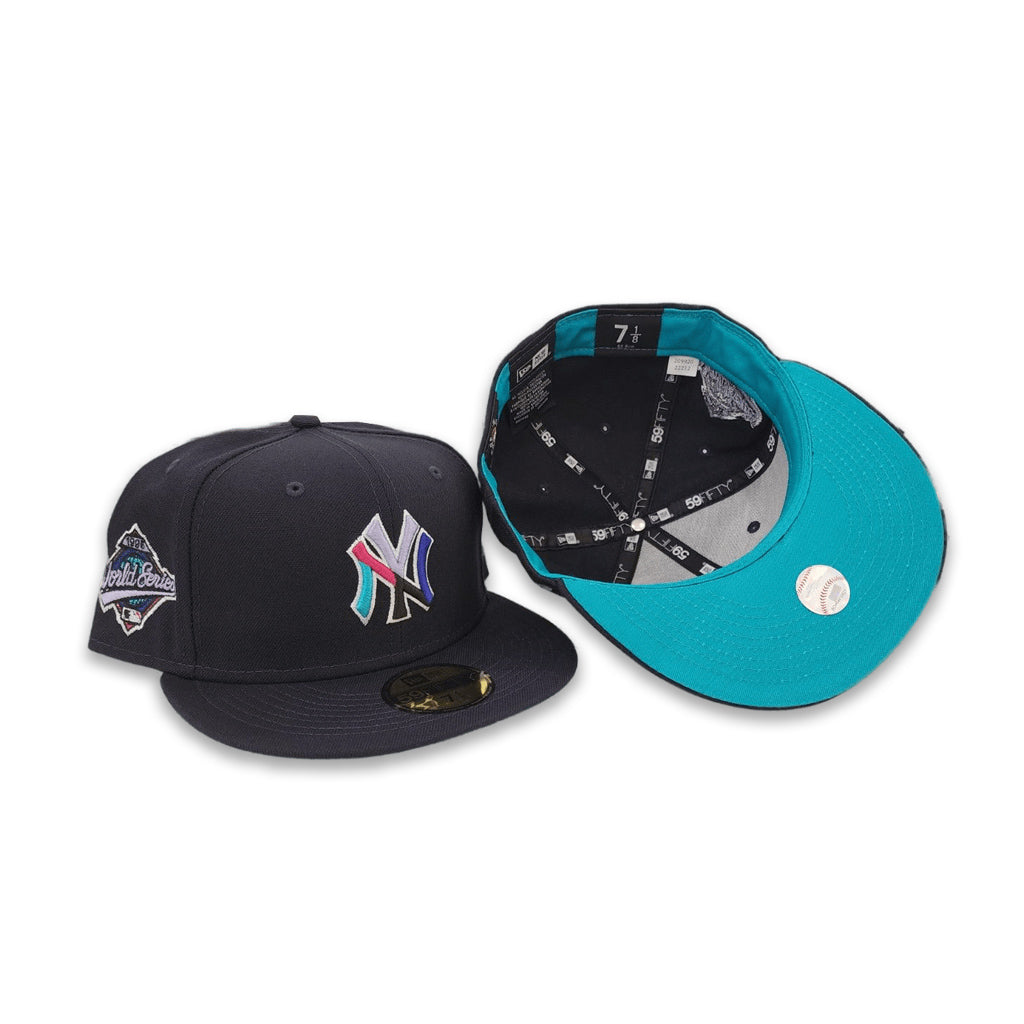 This New Era Polar Lights Navy Blue New York Yankees Turquoise Blue Bottom 1996 World Series Side Patch 59FIFTY Fitted Hat was released by Exclusive Fitted. The fitted has a navy blue six panel structured high crown and embroidered eyelets with a navy blue fabric squatchee button. The fitted cap also has a navy blue flat bill with a turquoise undervisor. The front panel features the New York Yankees logo embroidery and a 1996 World Series side patch embroidery on the right panel. The left panel of the fitted displays the New Era logo and the official MLB logo embroidery on the rear crown.