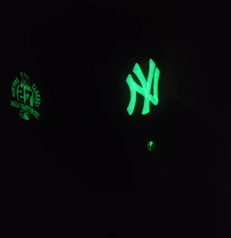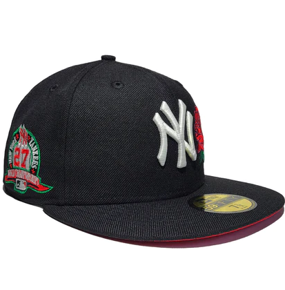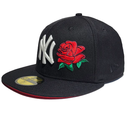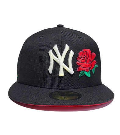 This New Era New York Yankees Red Rose 27 Champions Glow In The Dark 59FIFTY Fitted Hat has a black six panel structured high crown, embroidered eyelets and fabric squatchee button. The fitted cap has a black flat bill with a red undervisor and a white sweatband. The front panel features the New York Yankees logo embroidery with a large red rose embroidered slightly to the side. Additionally a 27 Champions side patch is embroidered on the right panel. The left panel of the fitted displays the New Era logo and the official MLB logo embroidery on the rear crown. This fitted hat glows in the dark as well.