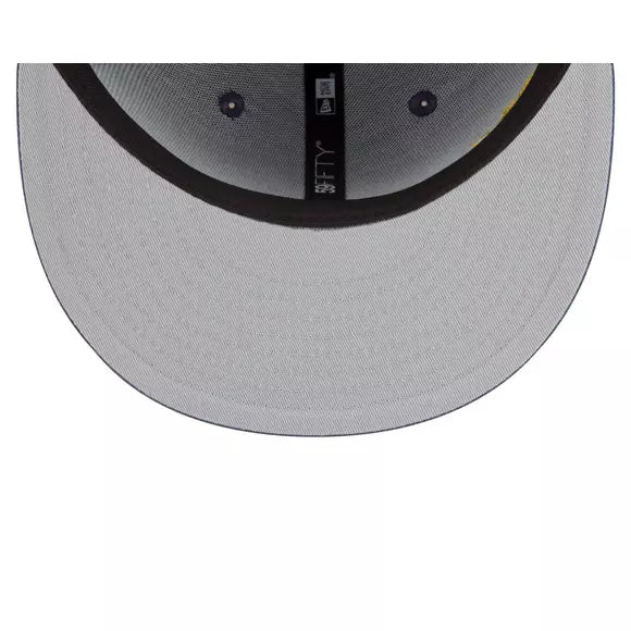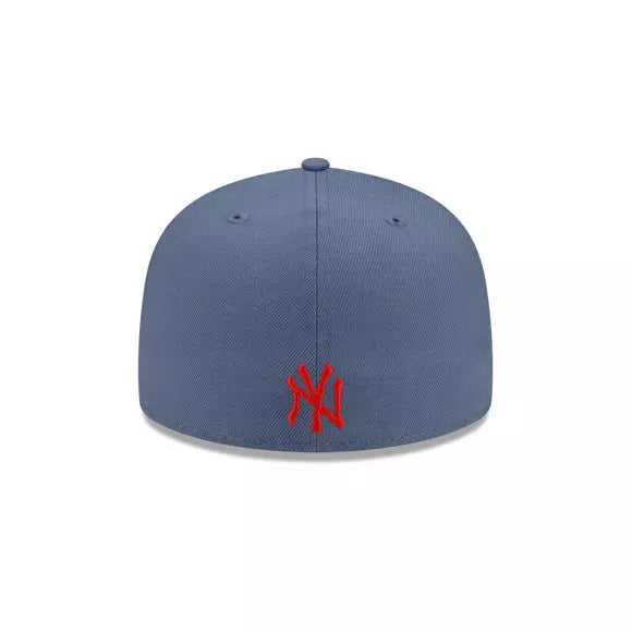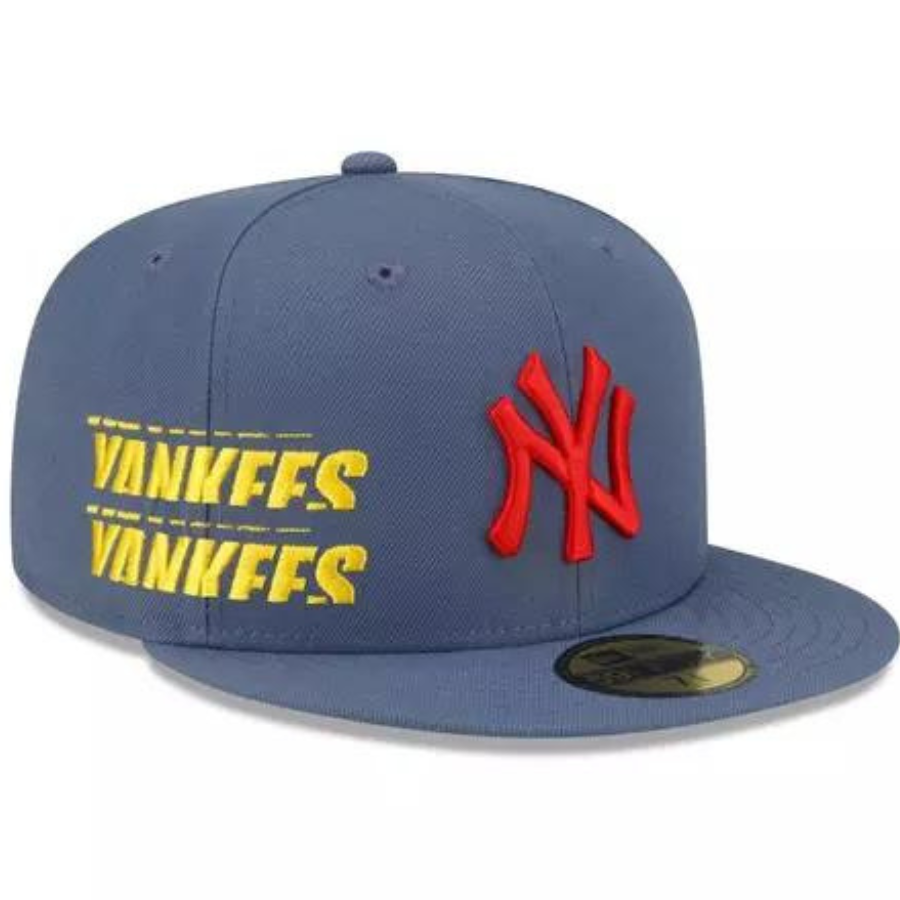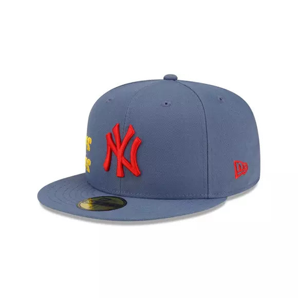 This New Era New York Yankees Stacked 59FIFTY fitted hat has a six panel structured high crown, embroidered eyelets and fabric squatchee button. The flat bill of the fitted is also slate with a grey undervisor and black sweatband. The front panel features the New York Yankees logo embroidery in red with a yellow stacked Yankees script between the right and front panel.