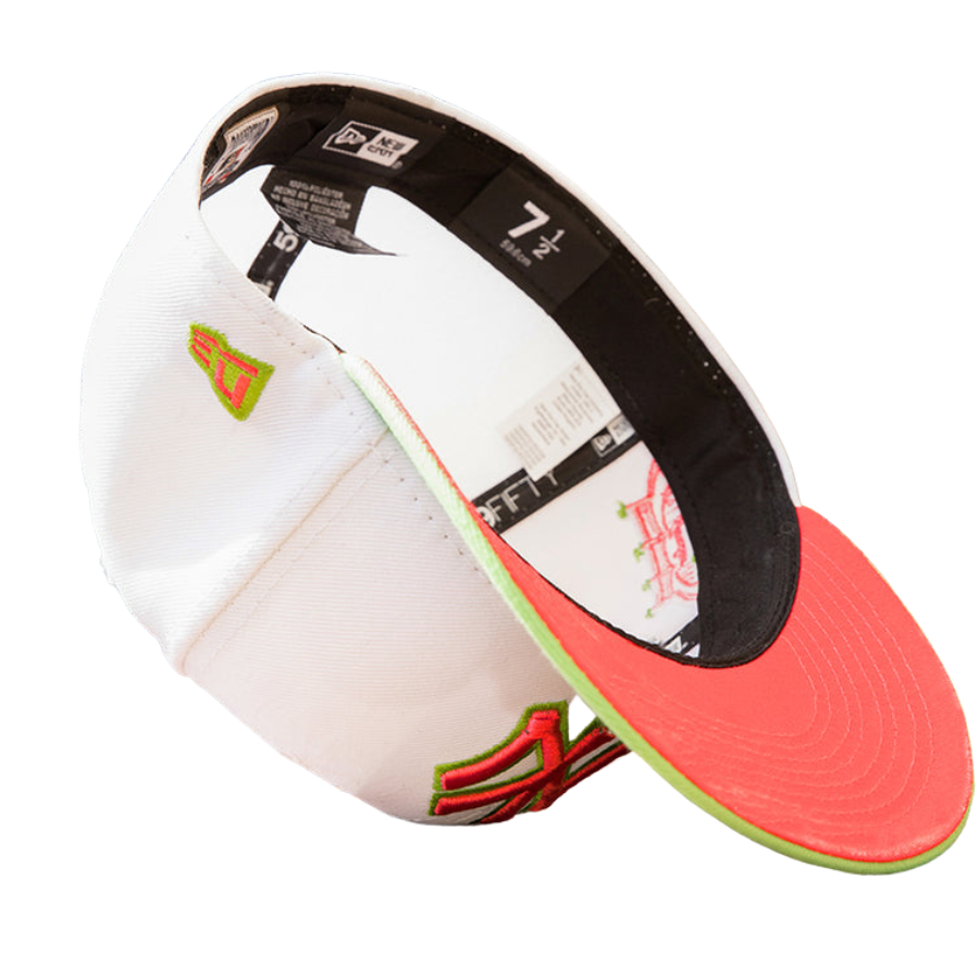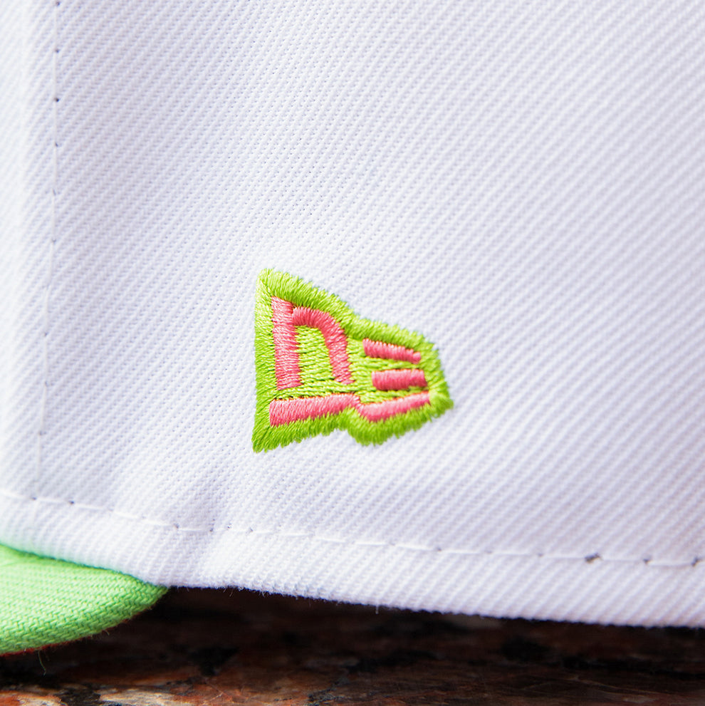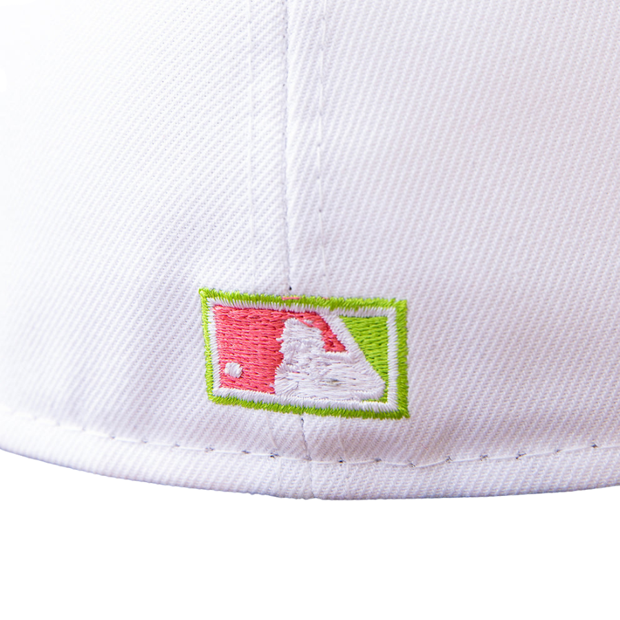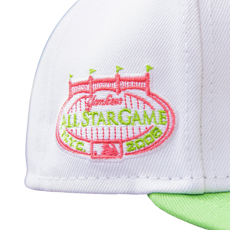 This New Era New York Yankees White/Lime Green 2006 All-Star Game 59FIFTY Fitted Hat a white six panel structured high crown and embroidered eyelets with a white fabric squatchee button. The fitted cap has a lime green flat bill with a hot pink undervisor and white sweatband. The front panel features NY Yankees logo embroidery and 2006 All-Star Game side patch embroidery on the right panel. The left panel of the fitted displays the New Era logo and the official MLB logo embroidery on the rear crown.