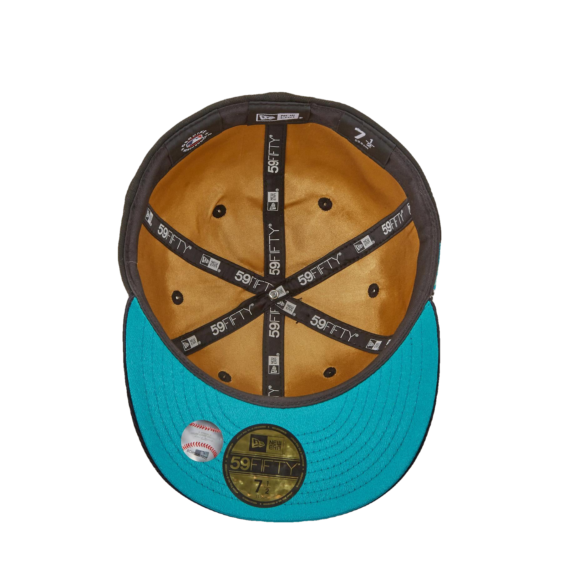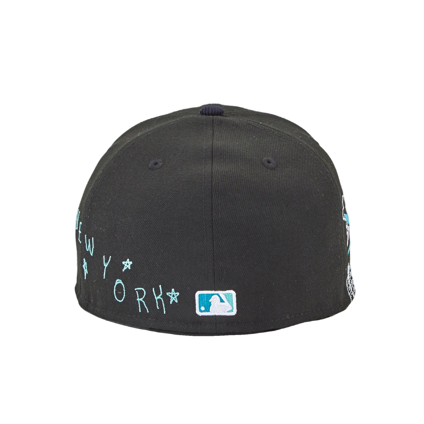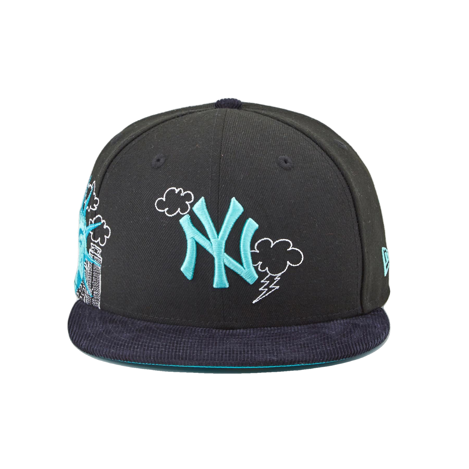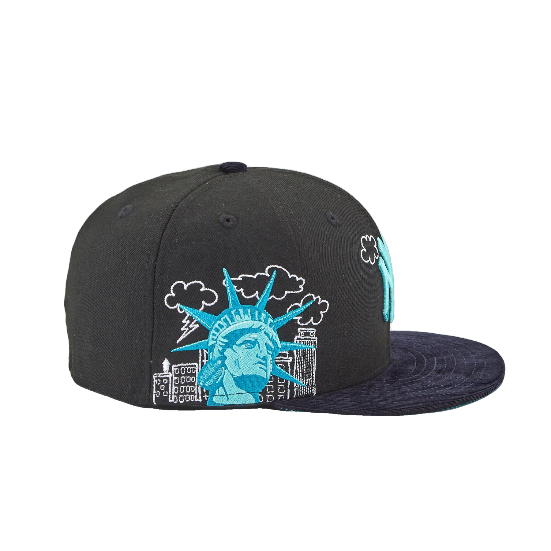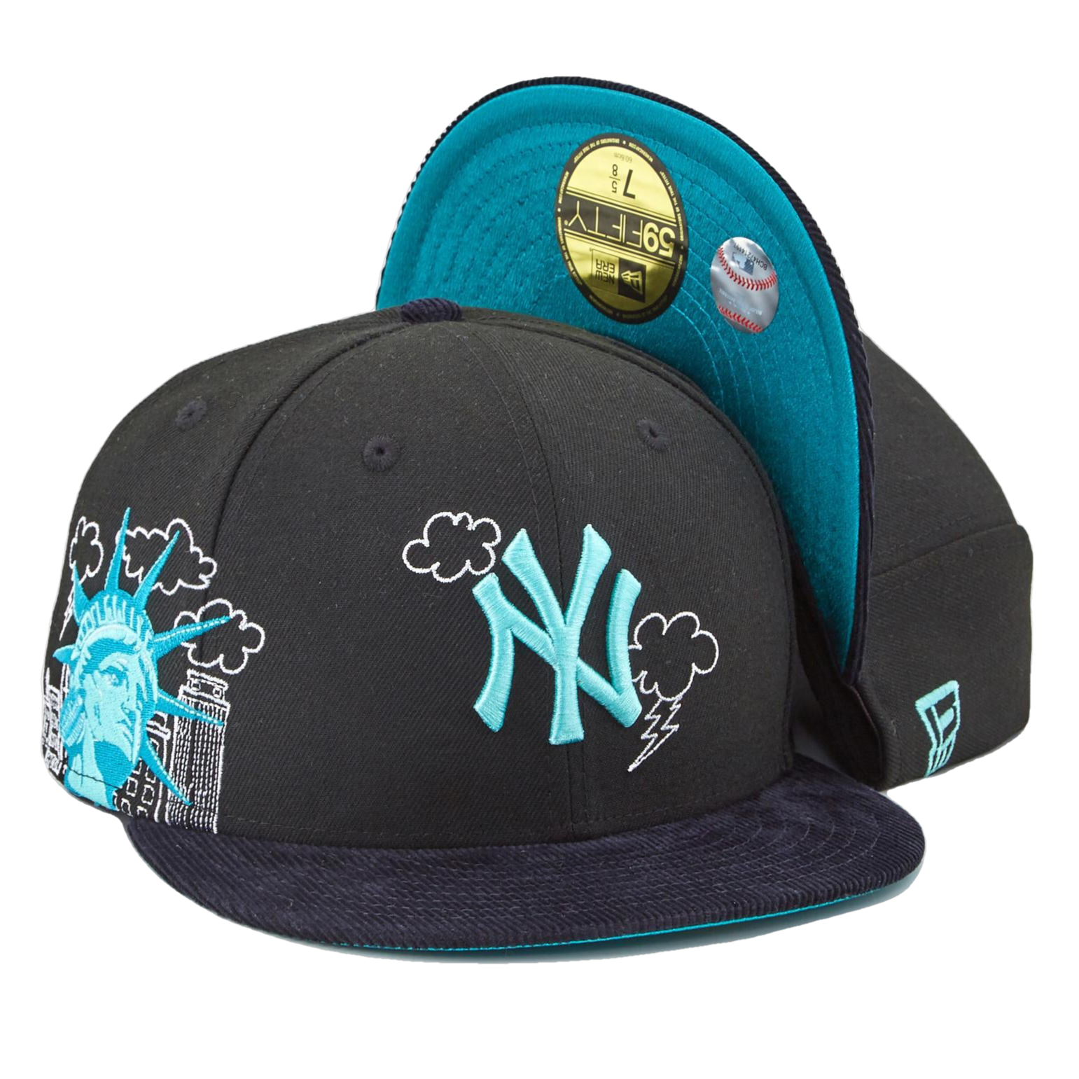 This New Era New York Yankees fitted hat was released by Eblens. The fitted has a black six panel structured high crown and embroidered eyelets and fabric squatchee button. The fitted cap also has a navy blue corduroy flat bill with a turquoise undervisor and black sweatband with a gold inner crown. The front panel features the NY Yankees logo embroidery and a side patch embroidery on the right panel. The left panel of the fitted displays the New Era logo and the official MLB logo embroidery on the rear crown.