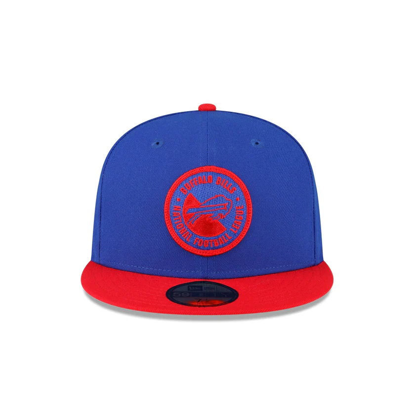 The Buffalo Bills 2023 Sideline Team Patch 59FIFTY Fitted Cap features an embroidered Buffalo Bills patch at the front panels with a matching NFL Shield at the right-wear side. Additional details include a team wordmark at the rear and a gray undervisor.