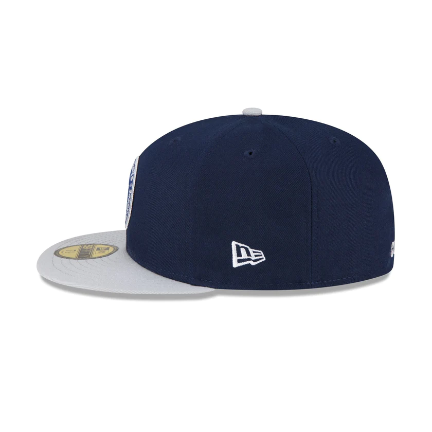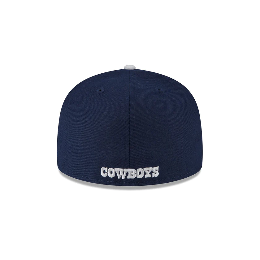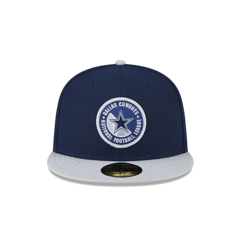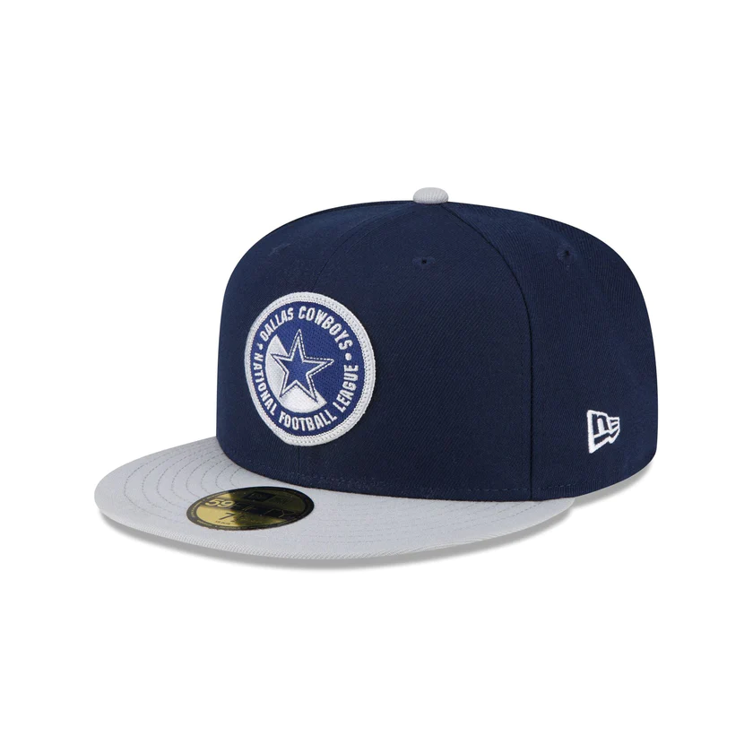 The Dallas Cowboys 2023 Sideline Team Patch 59FIFTY Fitted Cap features an embroidered Dallas Cowboys patch at the front panels with a matching NFL Shield at the right-wear side. Additional details include a team wordmark at the rear and a gray undervisor.