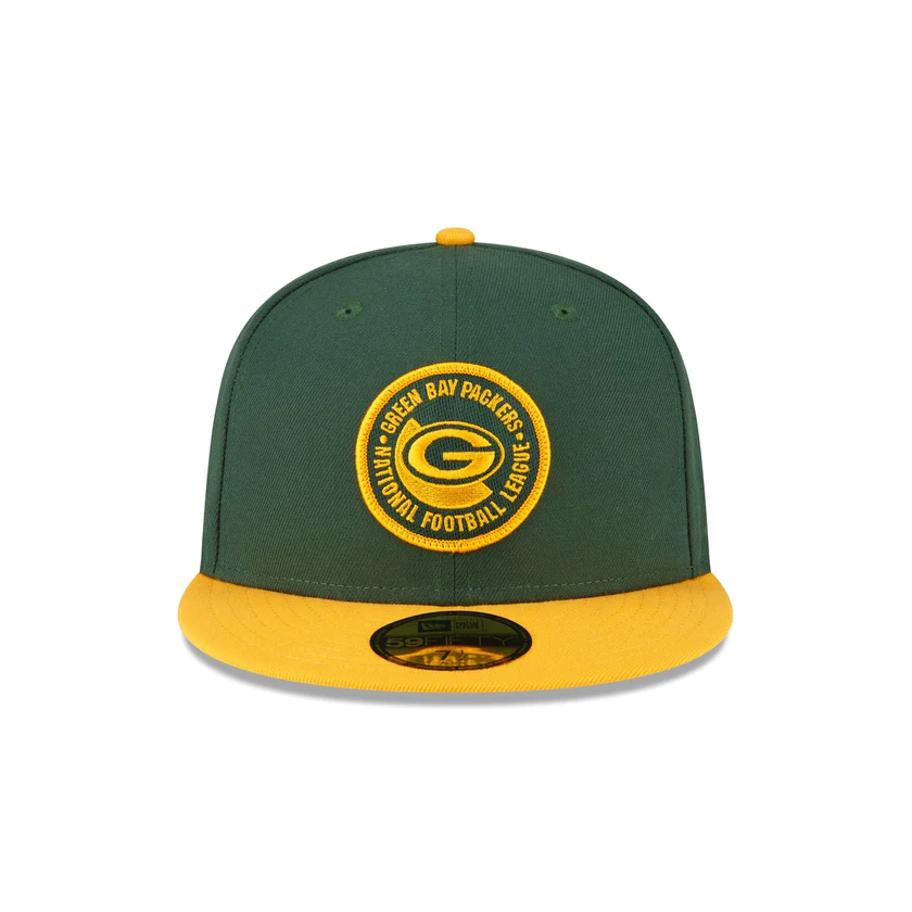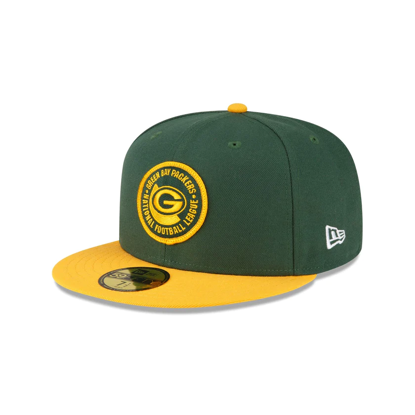 The Green Bay Packers 2023 Sideline Team Patch 59FIFTY Fitted Cap features an embroidered Green Bay Packers patch at the front panels with a matching NFL Shield at the right-wear side. Additional details include a team wordmark at the rear and a gray undervisor.