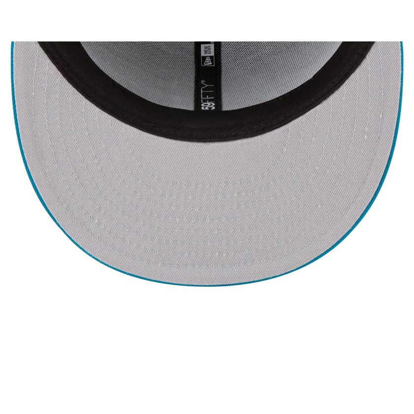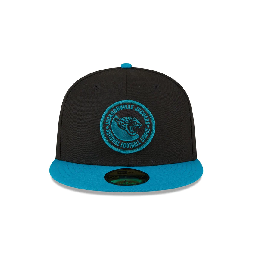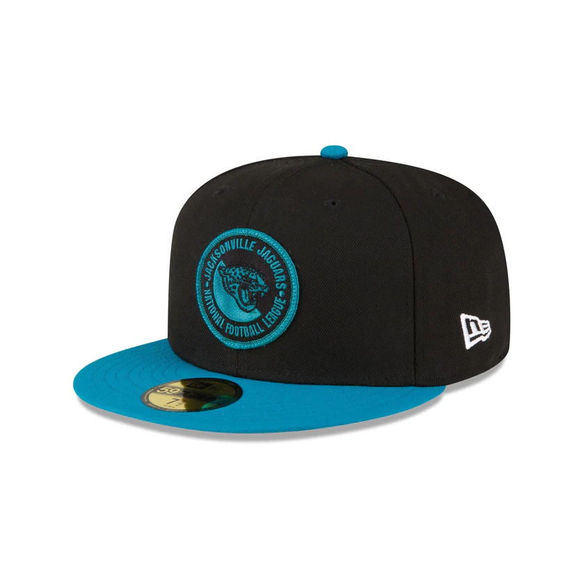The Jacksonville Jaguars 2023 Sideline Team Patch 59FIFTY Fitted Cap features an embroidered Jacksonville Jaguars patch at the front panels with a matching NFL Shield at the right-wear side. Additional details include a team wordmark at the rear and a gray undervisor.