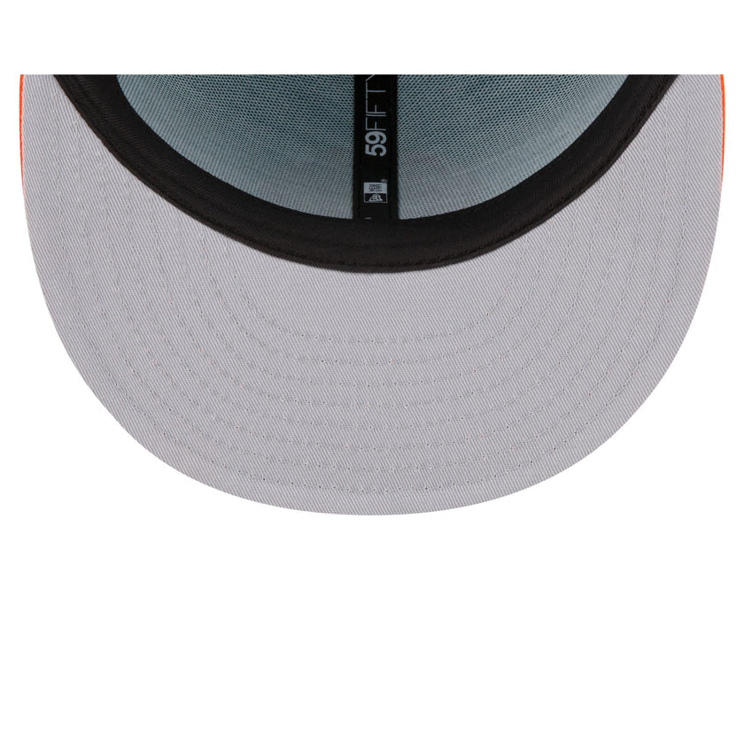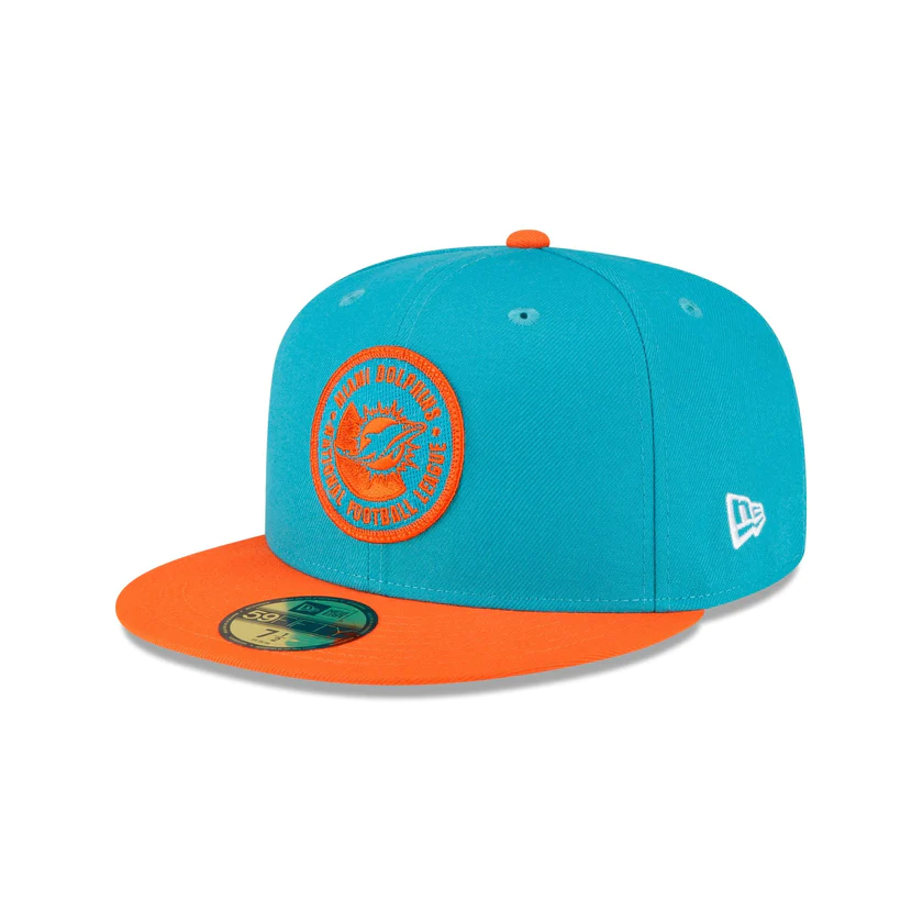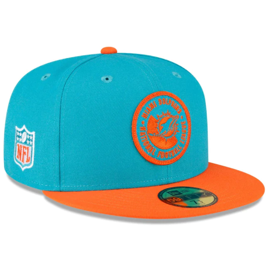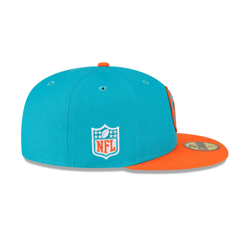 The Miami Dolphins 2023 Sideline Team Patch 59FIFTY Fitted Cap features an embroidered Miami Dolphins patch at the front panels with a matching NFL Shield at the right-wear side. Additional details include a team wordmark at the rear and a gray undervisor.