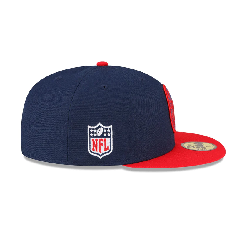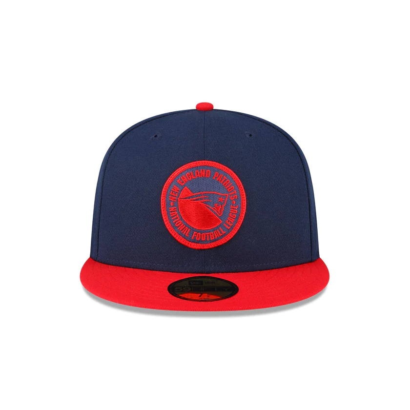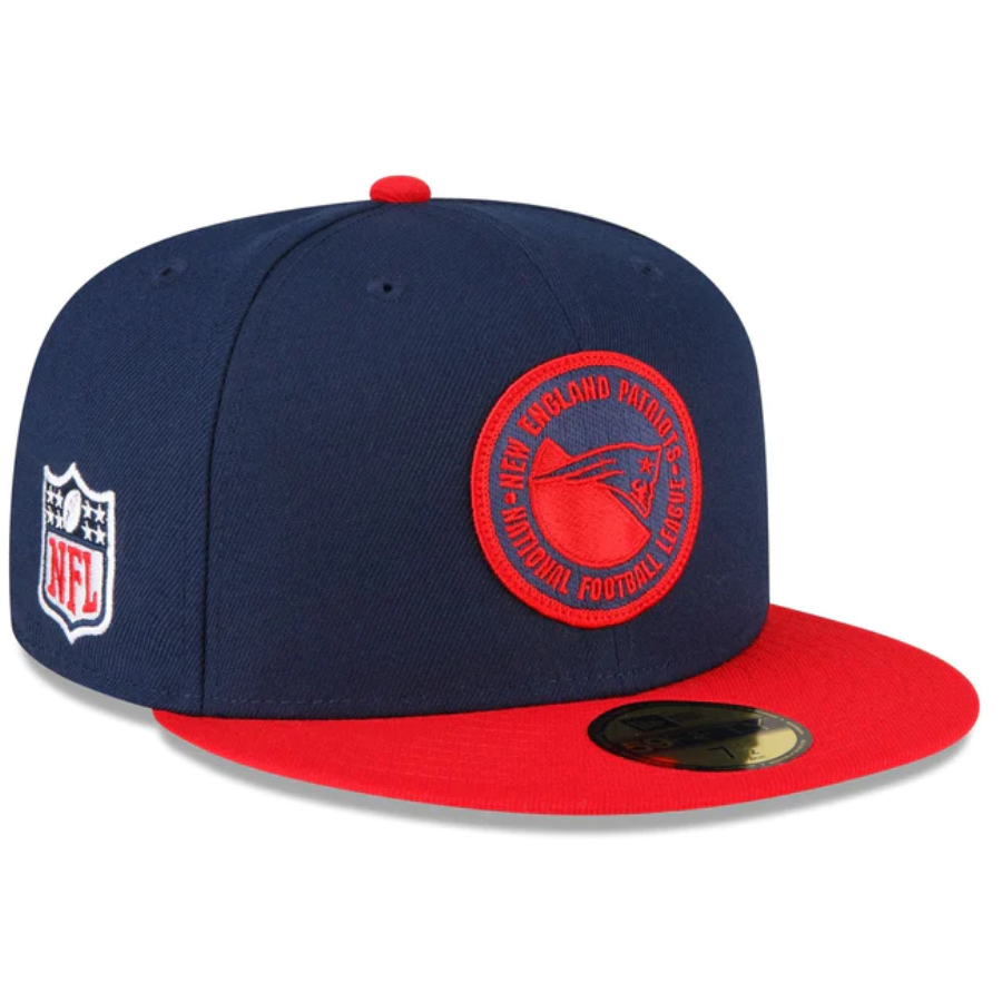The New England Patriots 2023 Sideline Team Patch 59FIFTY Fitted Cap features an embroidered New England Patriots patch at the front panels with a matching NFL Shield at the right-wear side. Additional details include a team wordmark at the rear and a gray undervisor.
