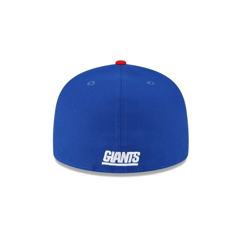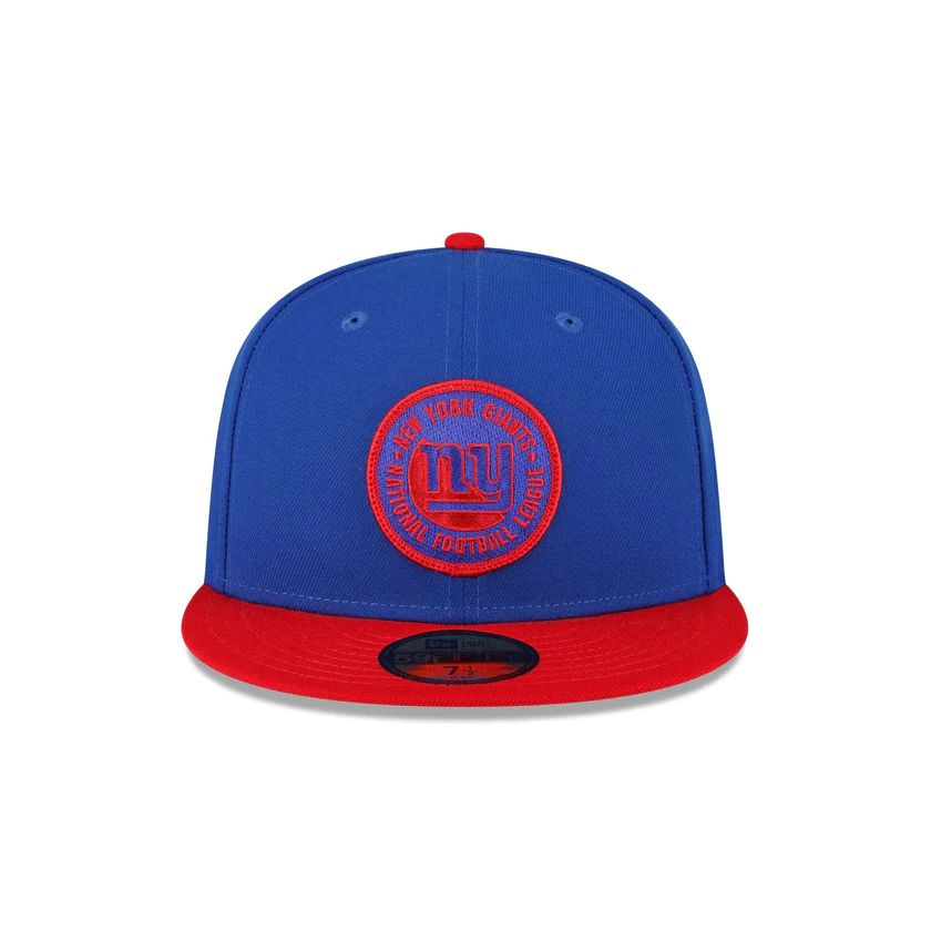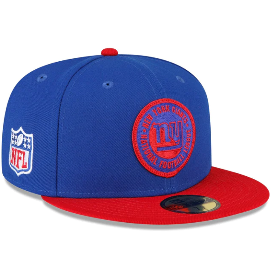 The New York Giants 2023 Sideline Team Patch 59FIFTY Fitted Cap features an embroidered New York Giants patch at the front panels with a matching NFL Shield at the right-wear side. Additional details include a team wordmark at the rear and a gray undervisor.