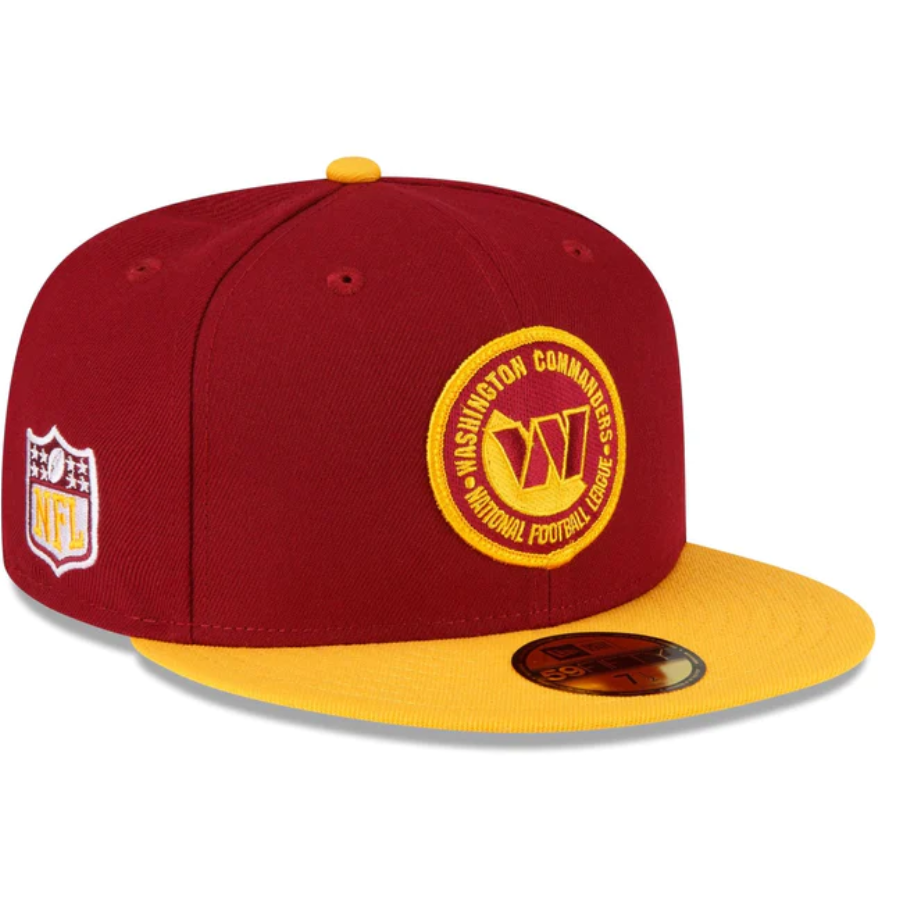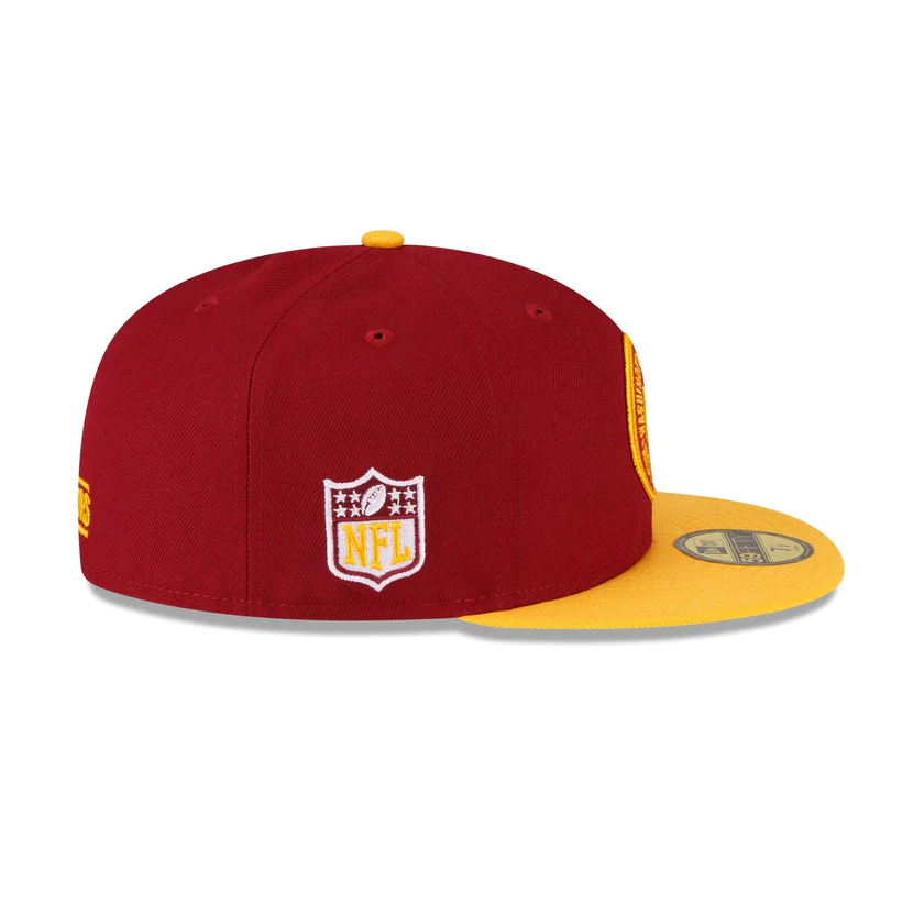 The Washington Commanders 2023 Sideline Team Patch 59FIFTY Fitted Cap features an embroidered Washington Commanders patch at the front panels with a matching NFL Shield at the right-wear side. Additional details include a team wordmark at the rear and a gray undervisor.