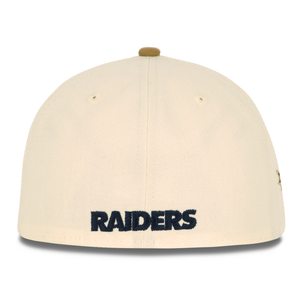 This New Era Las Vegas Raiders Harvester 2023 59FIFTY Fitted Hat was released by Just Sports. The fitted has a cream six panel structured high crown and embroidered eyelets with a tan fabric squatchee button. The flat bill of the fitted cap is also tan. The front panel features the Las Vegas Raiders logo embroidered in tan and midnight navy blue stitching. The left panel of the fitted displays the New Era logo and celebratory side patch on the right panel.