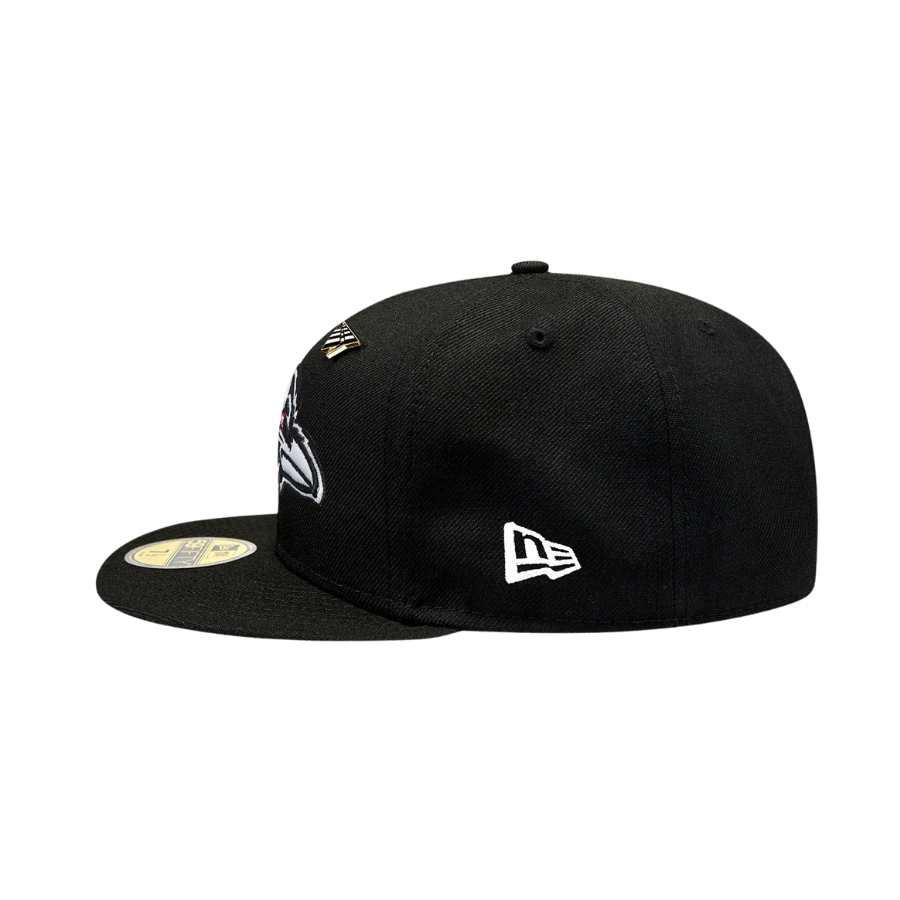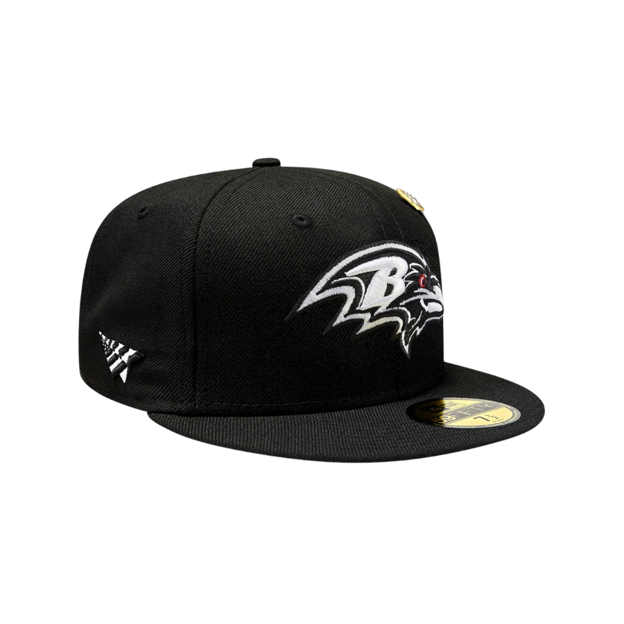 This New Era Paper Planes x Baltimore Ravens 59FIFTY Fitted Hat is a collaboration between Paper Planes x New Era & the NFL. The fitted has a black six panel structured high crown, embroidered eyelets and fabric squatchee button. The flat bill of the fitted cap is also black with a green undervisor and white sweatband. The front panel features the NFL team logo embroidery. The left panel of the fitted displays the New Era logo and the Paper Planes logo on the right panel. The NFL shield is embroidered on the rear crown.