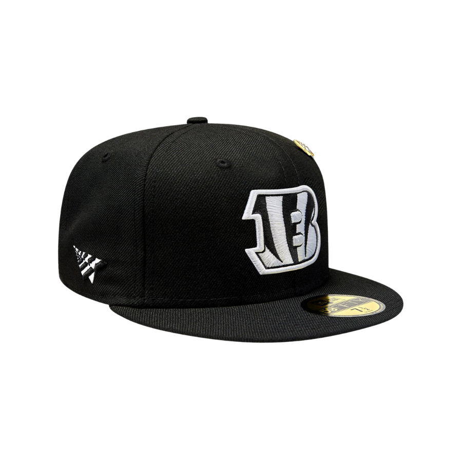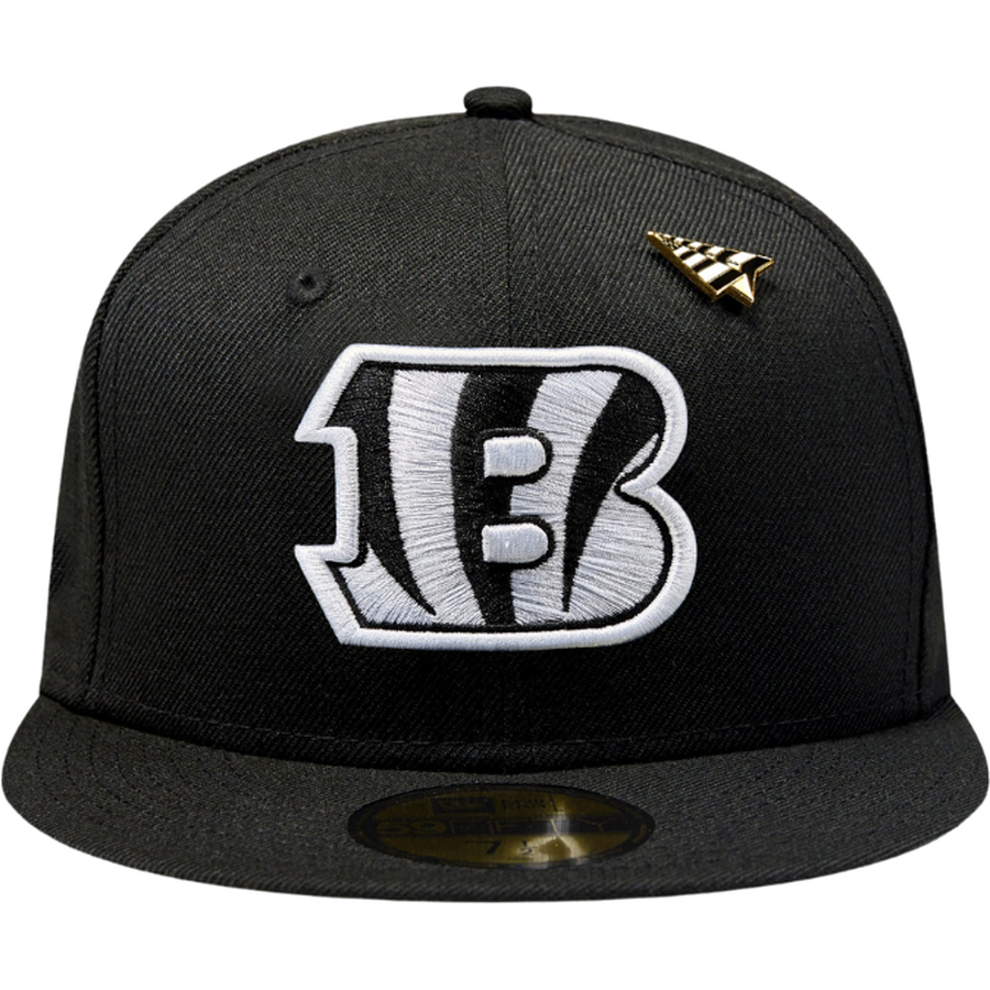 This New Era Paper Planes x Cincinnati Bengals 59FIFTY Fitted Hat is a collaboration between Paper Planes x New Era & the NFL. The fitted has a black six panel structured high crown, embroidered eyelets and fabric squatchee button. The flat bill of the fitted cap is also black with a green undervisor and white sweatband. The front panel features the NFL team logo embroidery. The left panel of the fitted displays the New Era logo and the Paper Planes logo on the right panel. The NFL shield is embroidered on the rear crown.
