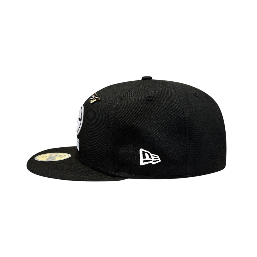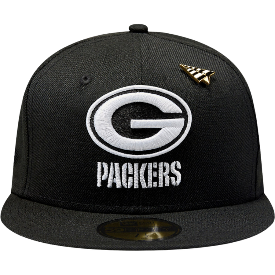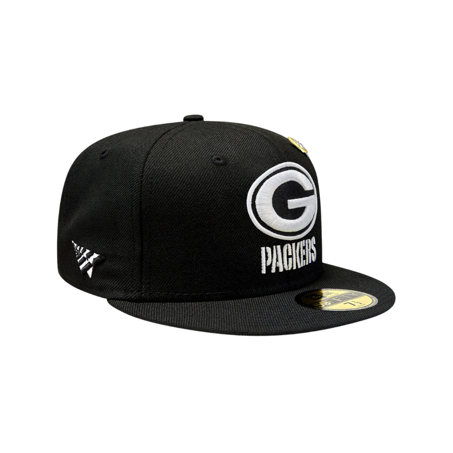 This New Era Paper Planes x Green Bay Packers 59FIFTY Fitted Hat is a collaboration between Paper Planes x New Era & the NFL. The fitted has a black six panel structured high crown, embroidered eyelets and fabric squatchee button. The flat bill of the fitted cap is also black with a green undervisor and white sweatband. The front panel features the NFL team logo embroidery. The left panel of the fitted displays the New Era logo and the Paper Planes logo on the right panel. The NFL shield is embroidered on the rear crown.