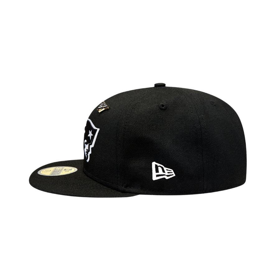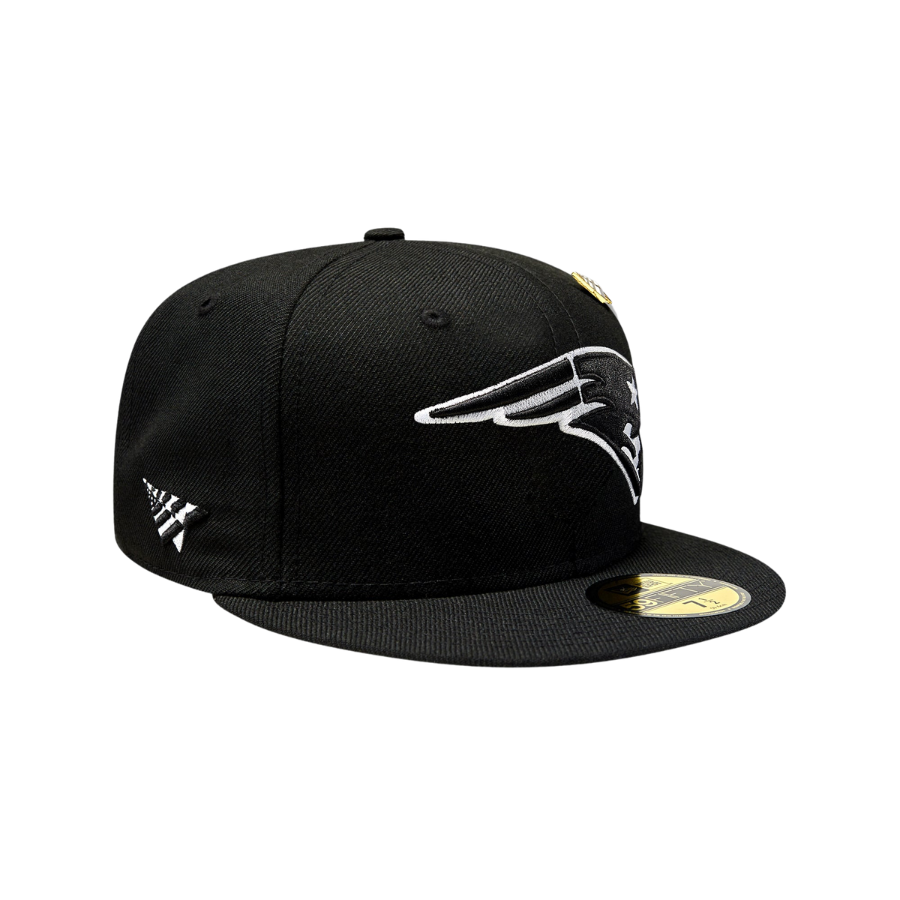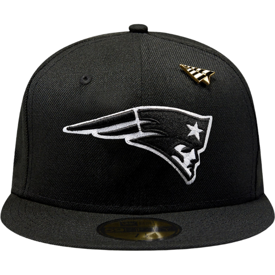 This New Era Paper Planes x New England Patriots 59FIFTY Fitted Hat is a collaboration between Paper Planes x New Era & the NFL. The fitted has a black six panel structured high crown, embroidered eyelets and fabric squatchee button. The flat bill of the fitted cap is also black with a green undervisor and white sweatband. The front panel features the NFL team logo embroidery. The left panel of the fitted displays the New Era logo and the Paper Planes logo on the right panel. The NFL shield is embroidered on the rear crown.