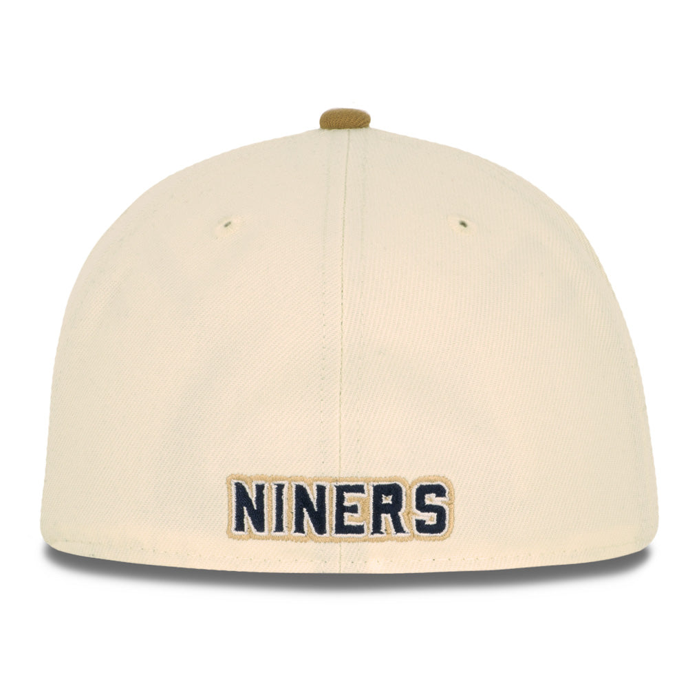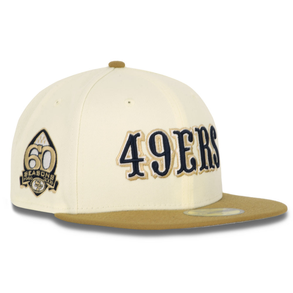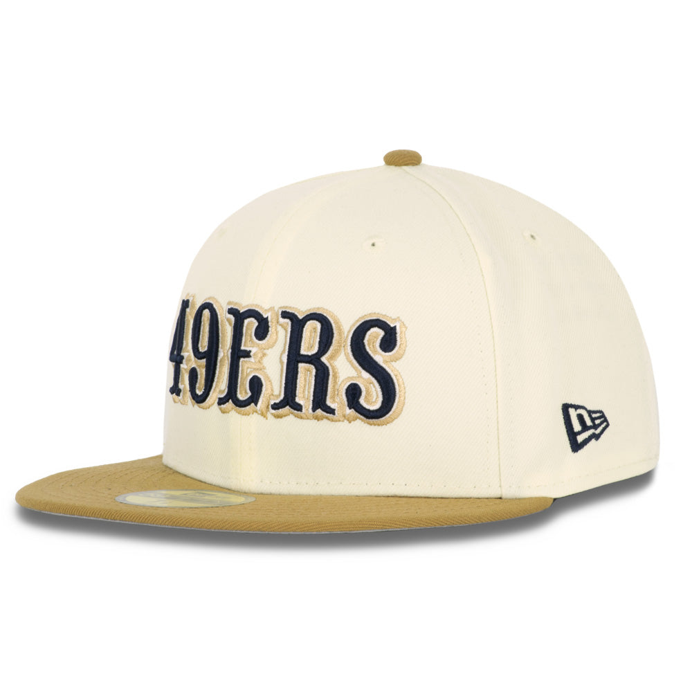 This New Era San Francisco 49ers Harvester 2023 59FIFTY Fitted Hat was released by Just Sports. The fitted has a cream six panel structured high crown and embroidered eyelets with a tan fabric squatchee button. The flat bill of the fitted cap is also tan. The front panel features the San Francisco 49ers logo embroidered in tan and midnight navy blue stitching. The left panel of the fitted displays the New Era logo and celebratory side patch on the right panel.