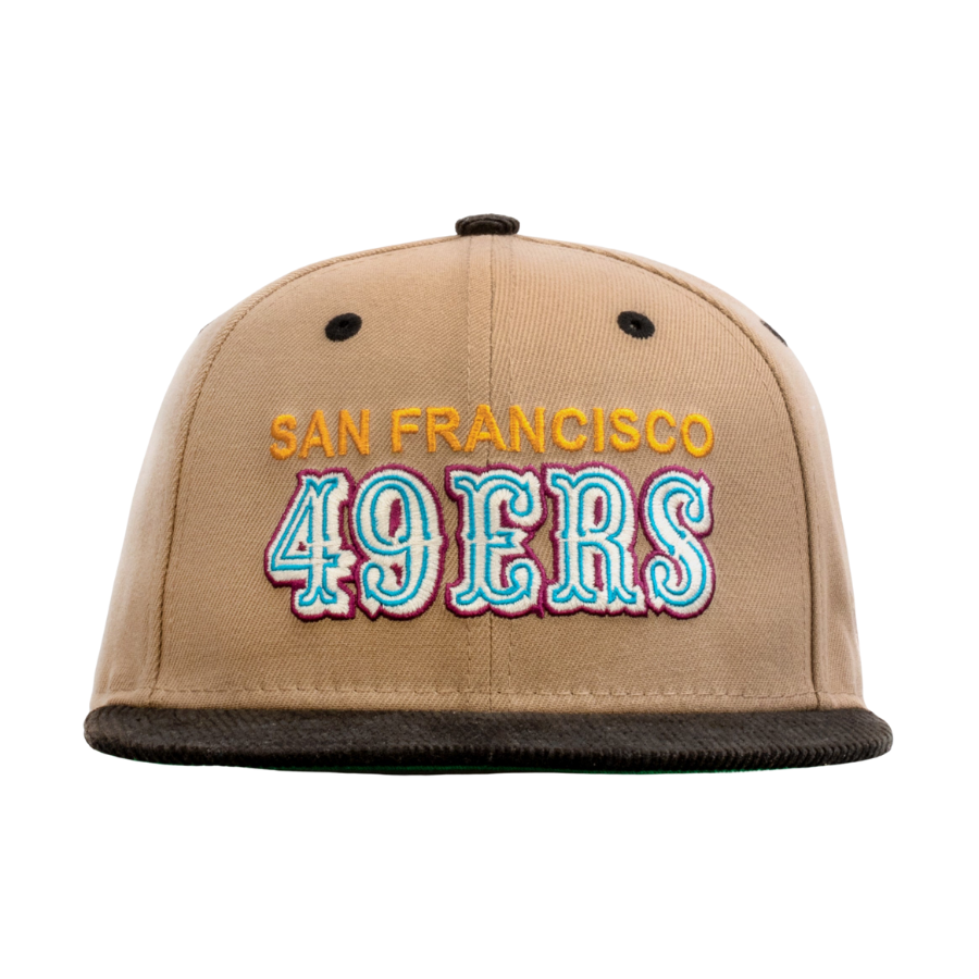 This New Era x SP 'Desert Sky' San Francisco 49ers 2023 59FIFTY Fitted Hat was released by Shoe Palace. The fitted has a tan six panel structured high crown and black embroidered eyelets with a black fabric squatchee button. The flat bill of the fitted cap is also black corduroy with a green undervisor and white sweatband. The front panel features the San Francisco 49ers logo embroidery. The left panel of the fitted displays the New Era logo and the NFL shield and desert cactus embroidered on the rear crown.