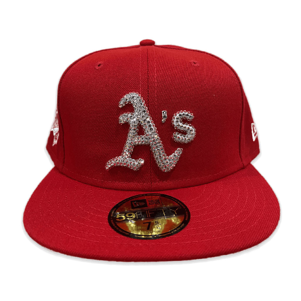 This New Era Oakland Athletics 1989 World Series Red Swarovski 59FIFTY Fitted Hat was released by Exclusive Fitted. The fitted has a red six panel structured high crown, embroidered eyelets and fabric squatchee button. The flat bill of the fitted cap is also red with a grey undervisor and black sweatband. The front panel features the Oakland Athletics logo embroidered in white stitching with swarovski crystals all over. The left panel of the fitted displays the New Era logo and celebratory side patch on the right panel. The official MLB Batterman logo is embroidered on the rear crown.