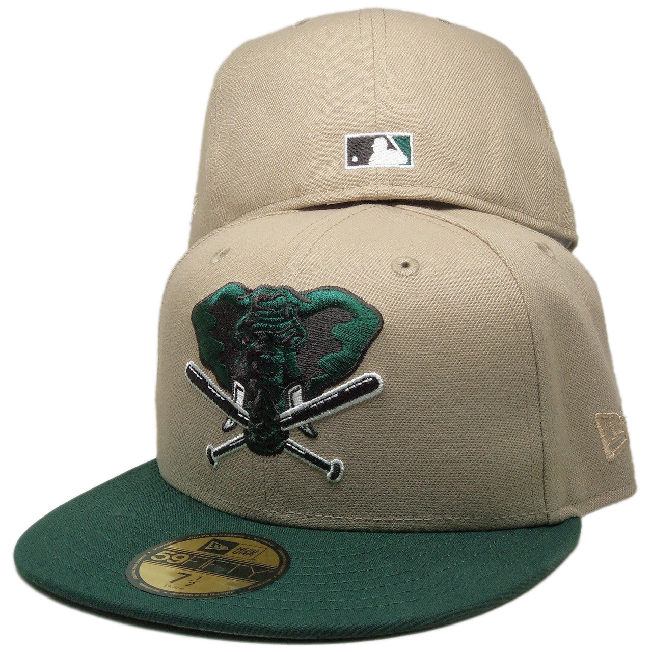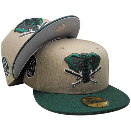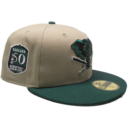 This Oakland Athletics fitted hat released by Ecapsunlimited has a khaki six panel structured high crown and embroidered eyelets with a dark green fabric squatchee button. The fitted cap also has a dark green flat bill with a light gray undervisor and white sweatband. The front panel features the Oakland Athletics Stomper logo embroidery and a 50th anniversary side patch embroidery on the right panel. The left panel of the fitted displays the New Era logo and the official MLB Batterman logo embroidery on the rear crown.