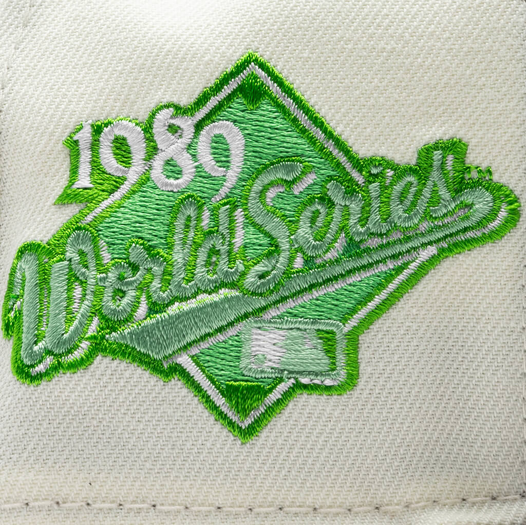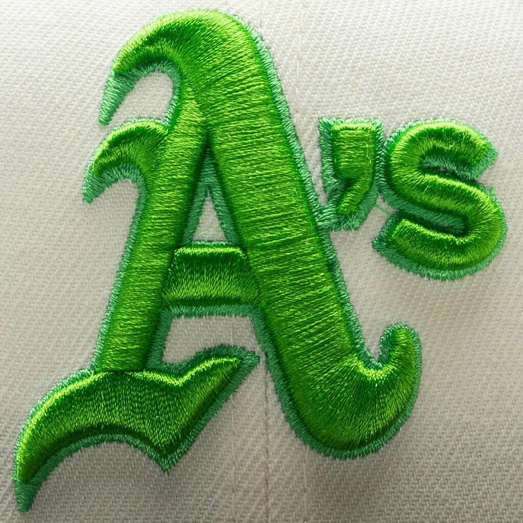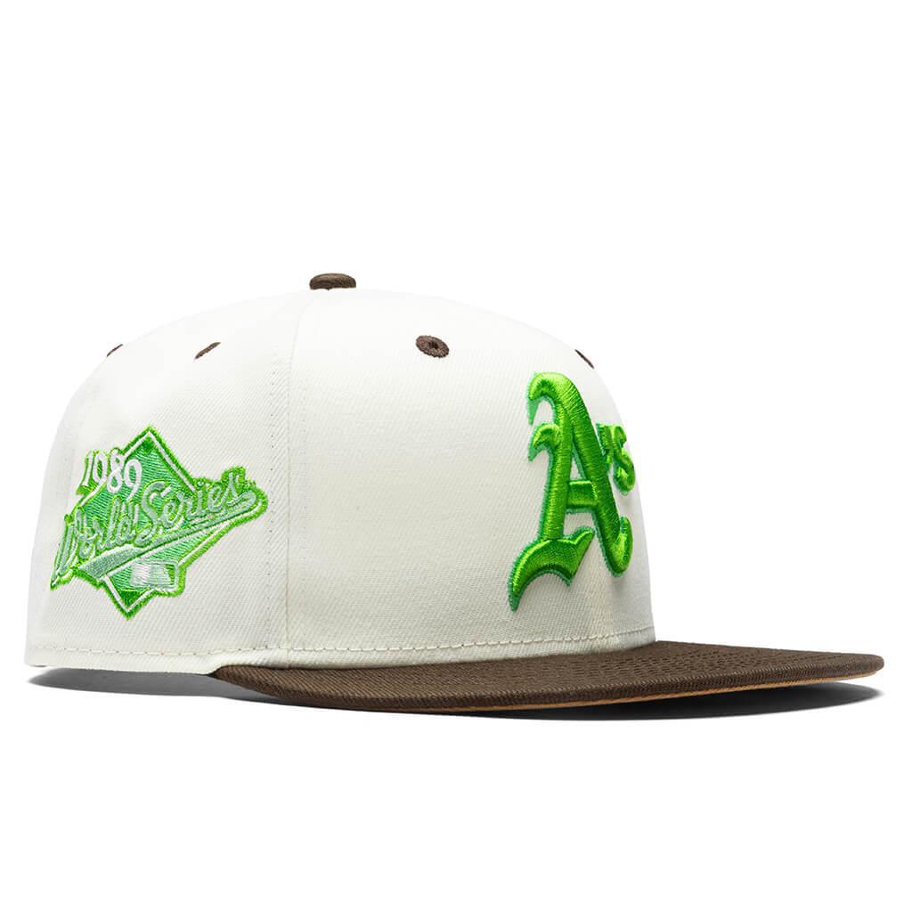 This New Era x Feature Oakland Athletics Bamboo 2023 59FIFTY Fitted Hat was released by Feature. The fitted has a chrome/white six panel structured high crown, dark brown embroidered eyelets & fabric squatchee button. The flat bill of the fitted cap is also dark brown with a lime green bottom undervisor with a white sweatband. The front panel features the Oakland Athletics logo embroidered in lime stitching with a side patch on the right panel in the same lime colorway. The left panel of the fitted displays the New Era logo and the official MLB Batterman on the rear-crown .