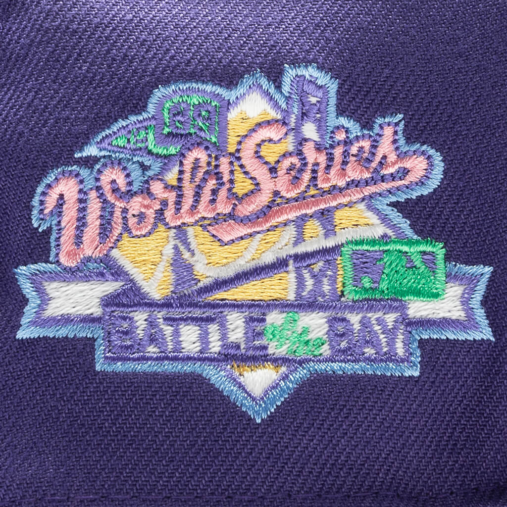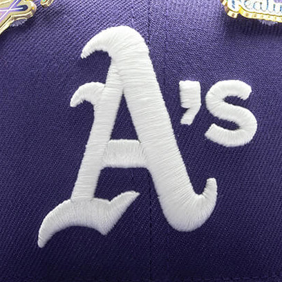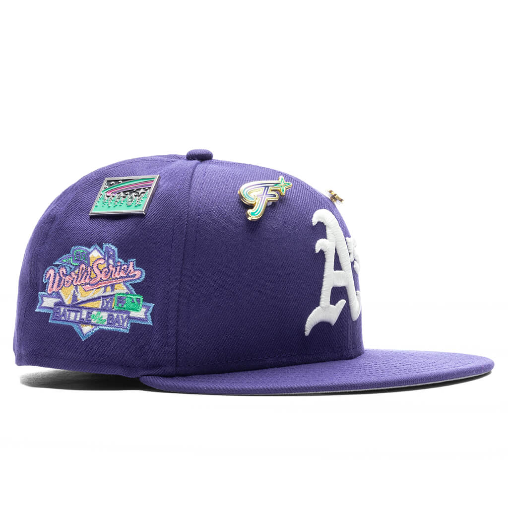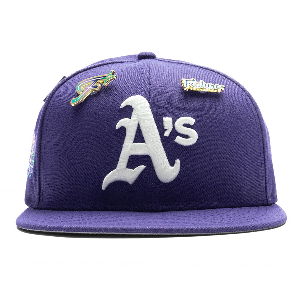 This New Era x Feature Oakland Athletics Northern Lights 59FIFTY Fitted Hat was released by Feature. The Northern Lights fitted has a light navy blue six panel structured high crown, grey embroidered eyelets and light navy blue flat bill. The fitted cap has a grey bottom undervisor with a black sweatband . The front panel features the Oakland Athletics logo embroidery and a side patch embroidered on the right panel. The left panel of the fitted displays the New Era logo and the official MLB logo embroidery on the rear crown.