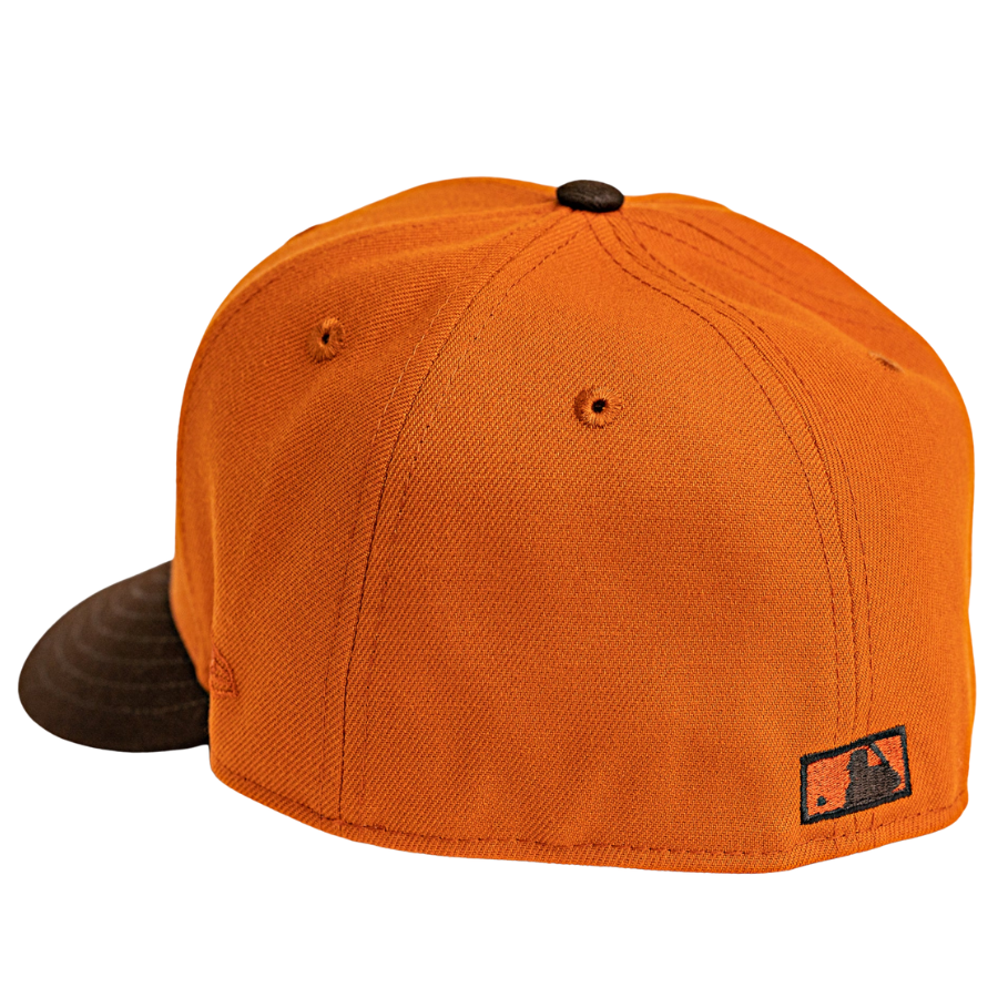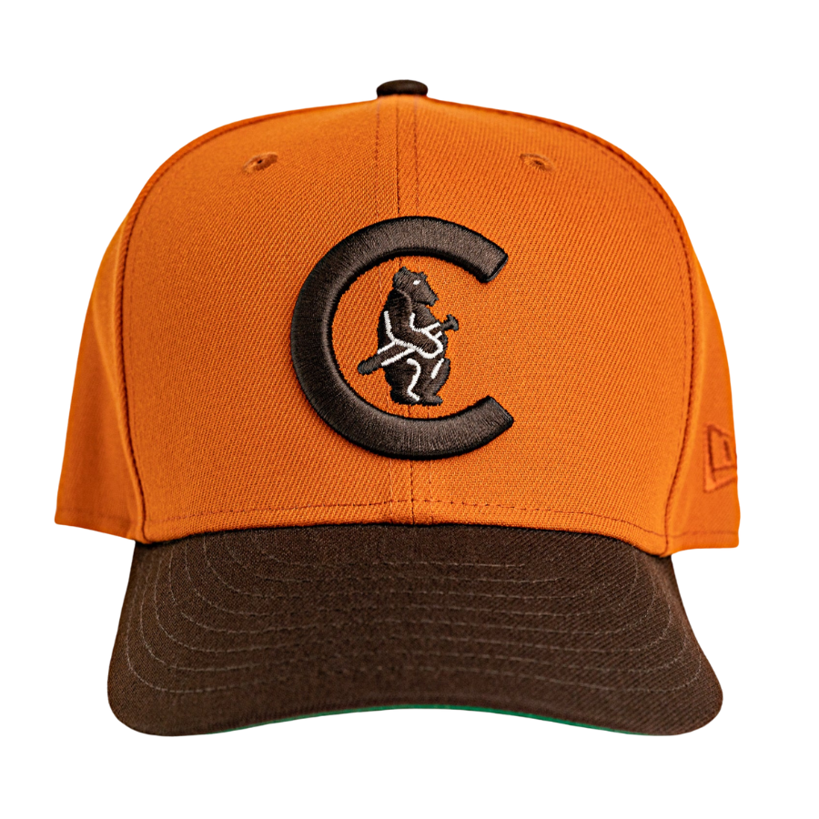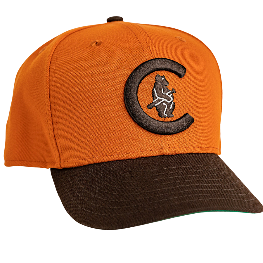 This Chicago Cubs fitted hat was released by Burdeens Chicago. The fitted has a burnt orange six panel structured high crown and embroidered eyelets with a burnt wood fabric squatchee button. The fitted cap also has a burnt wood flat bill. The front panel features a dark brown Chicago Cubs logo with no visble side patch on the right panel.