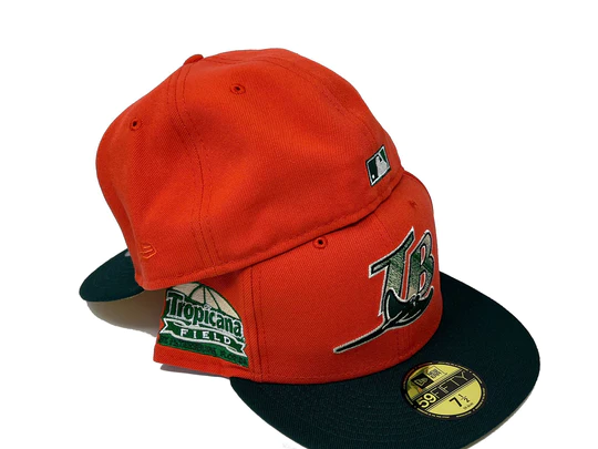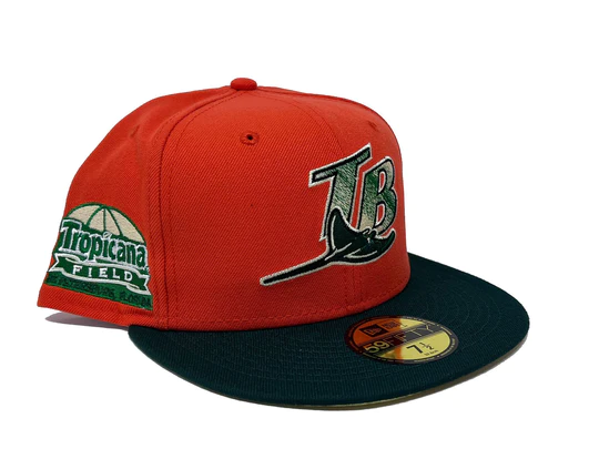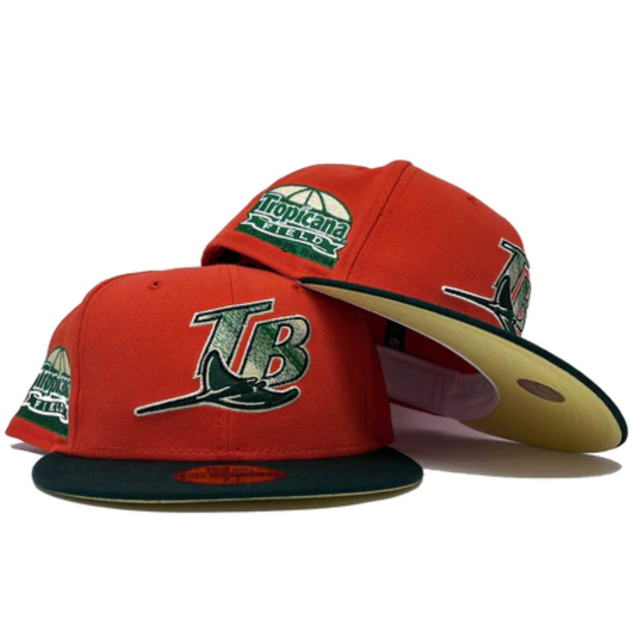 This New Era Tampa Bay Rays 59FIFTY fitted hat was released by Sports World 165. The fitted features an orange six panel construction with a black fabric squatchee button and flat bill. The fitted has a soft yellow undervisor and white sweatband. The front panel include the Tampa Bay Rays logo embroidery and a Tropicana Field side patch on the right panel.