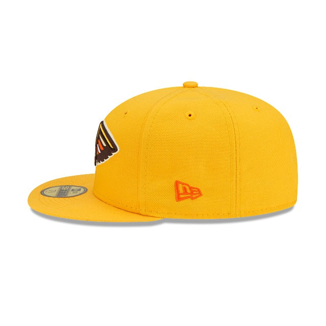 Enter at your own risk with the New Orleans Pelicans Spooky Treat 59FIFTY Fitted Cap featuring bright yellows and oranges with an embroidered Pelicans logo at the front panels and a matching NBA logo at the rear. Additional details include an orange undervisor.