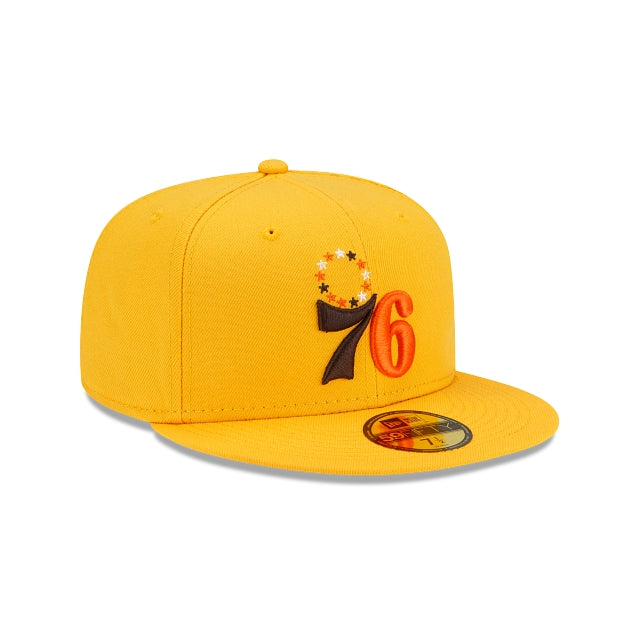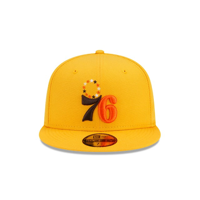 Enter at your own risk with the Philadelphia 76ers Spooky Treat 59FIFTY Fitted Cap featuring bright yellows and oranges with an embroidered 76ers logo at the front panels and a matching NBA logo at the rear. Additional details include an orange undervisor.