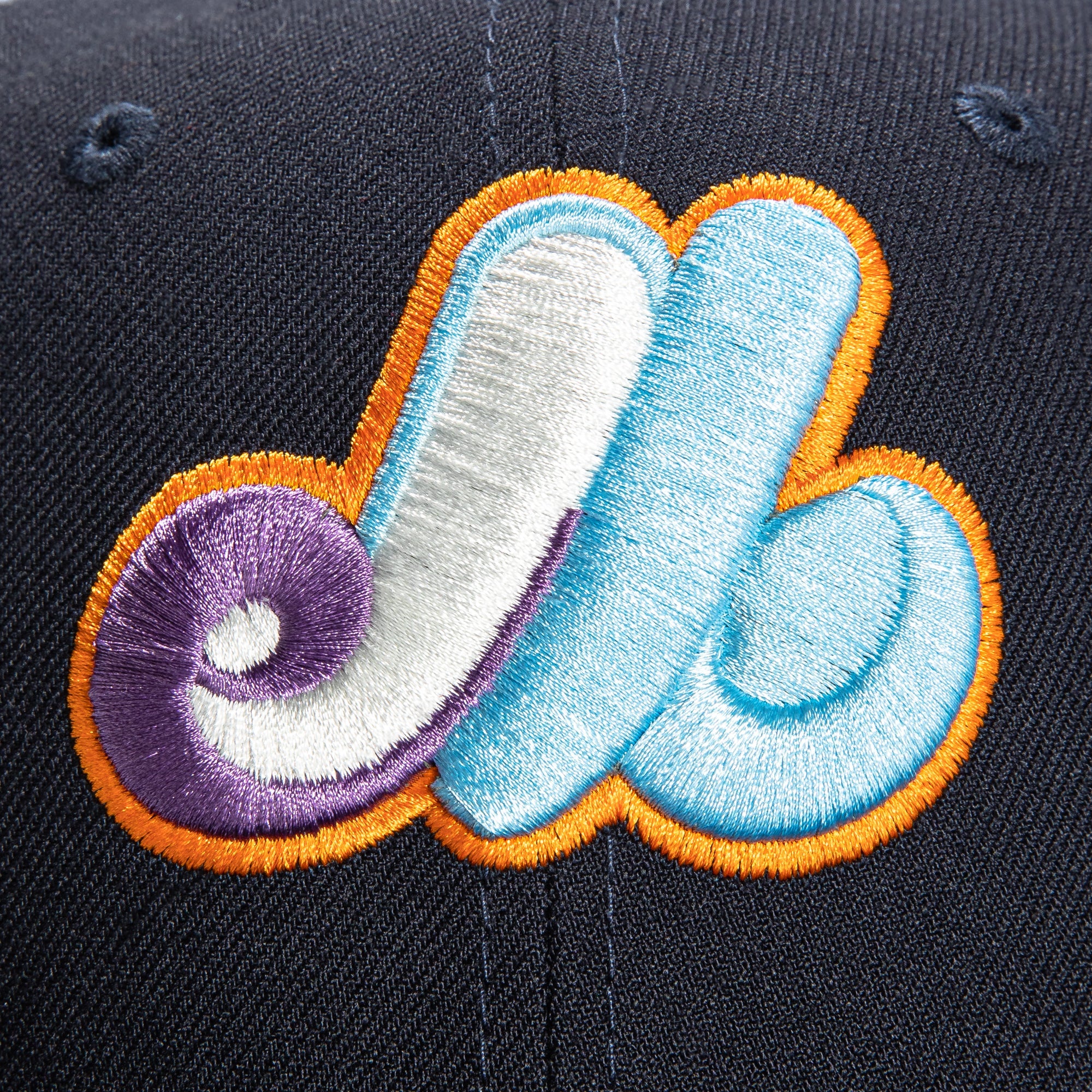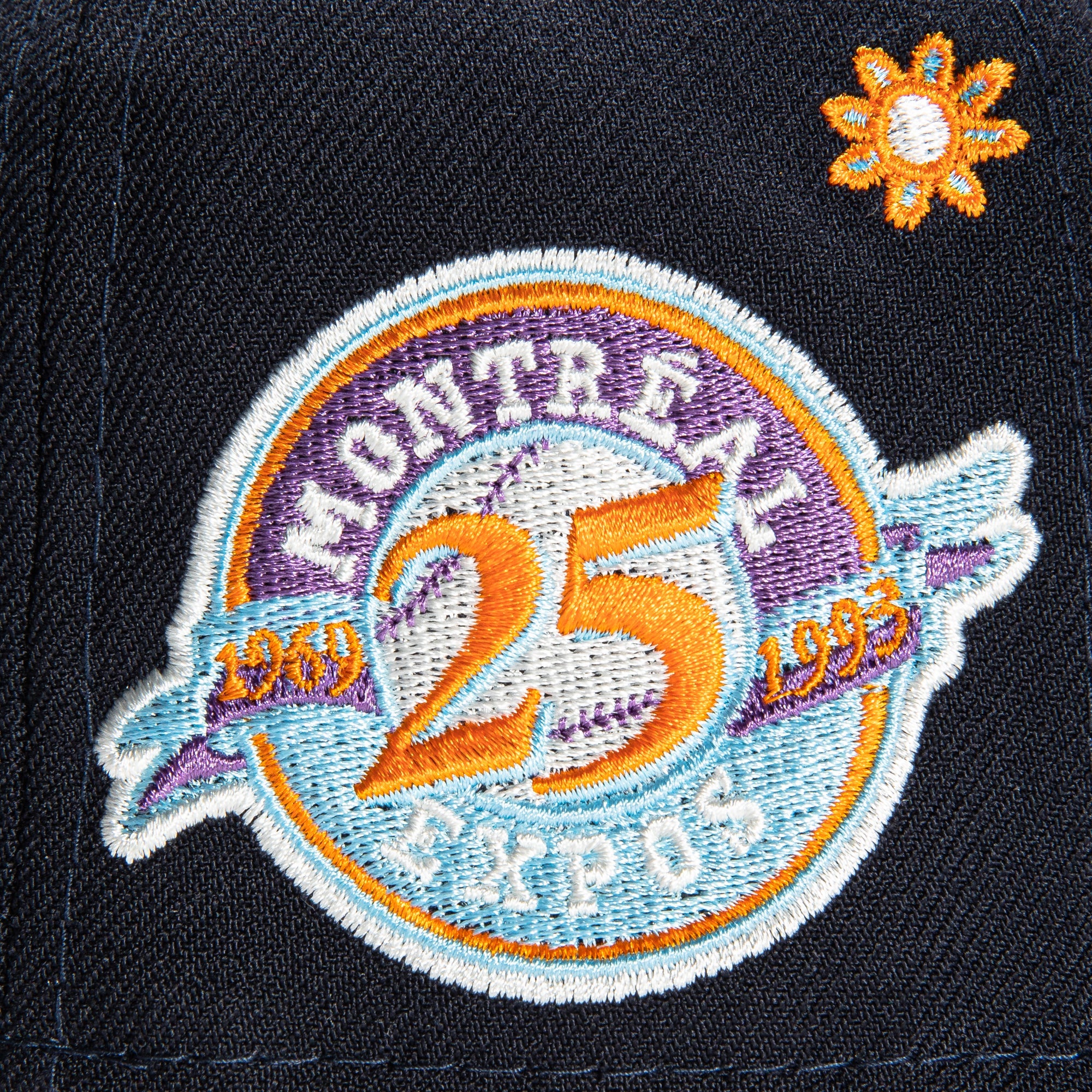 This New Era Super Bloom Montreal Expos 25th Anniversary 2022 59FIFTY Fitted Hat is a Hat Club exclusive. It has a navy six panel structured high crown and embroidered eyelets with a navy fabric squatchee button. The fitted cap has a navy flat bill with a orange undervisor. The front panel features the Montreal Expos logo embroidery and a 25th Anniversary side patch embroidery on the right panel. The left panel of the fitted displays the New Era logo and the official MLB logo embroidery on the rear crown.