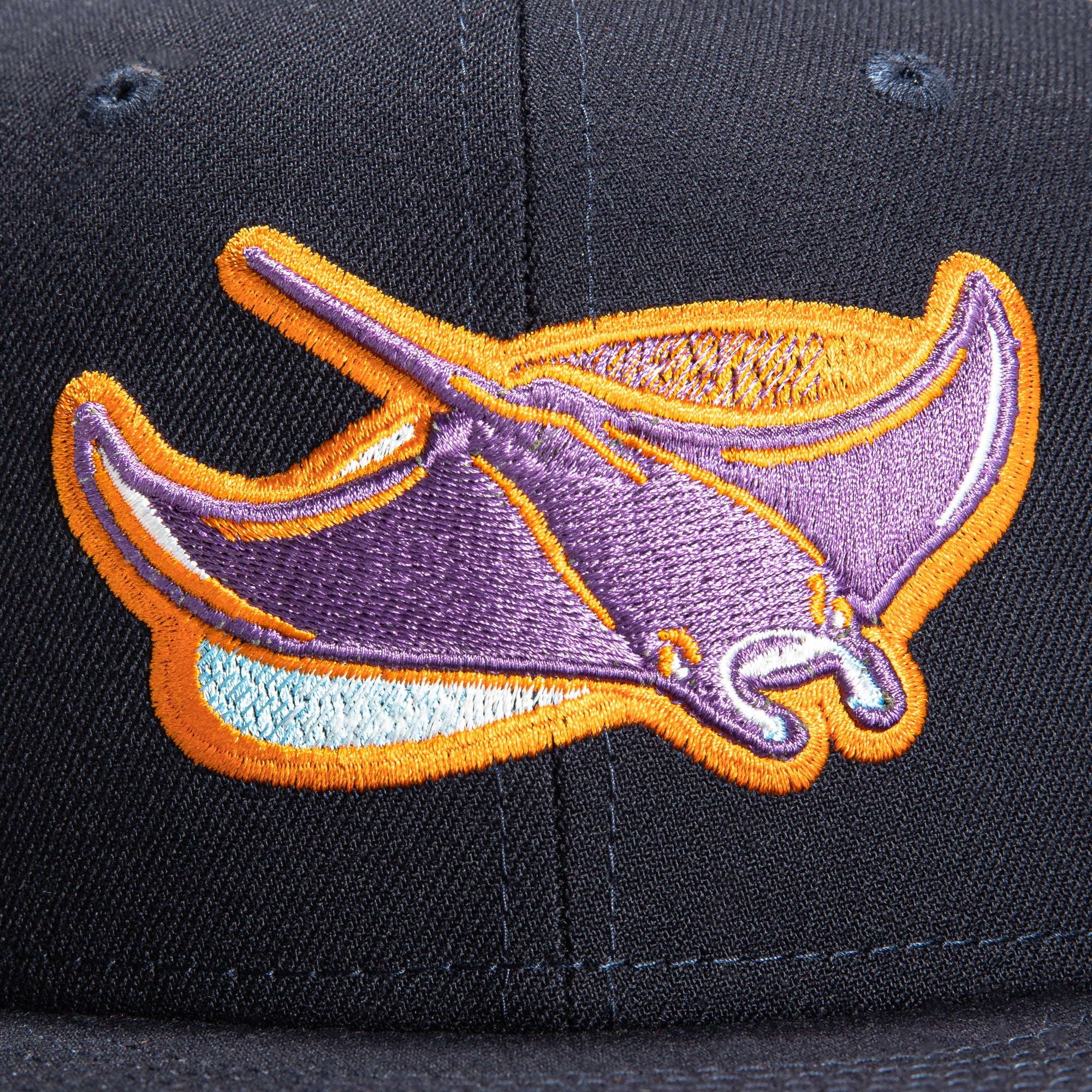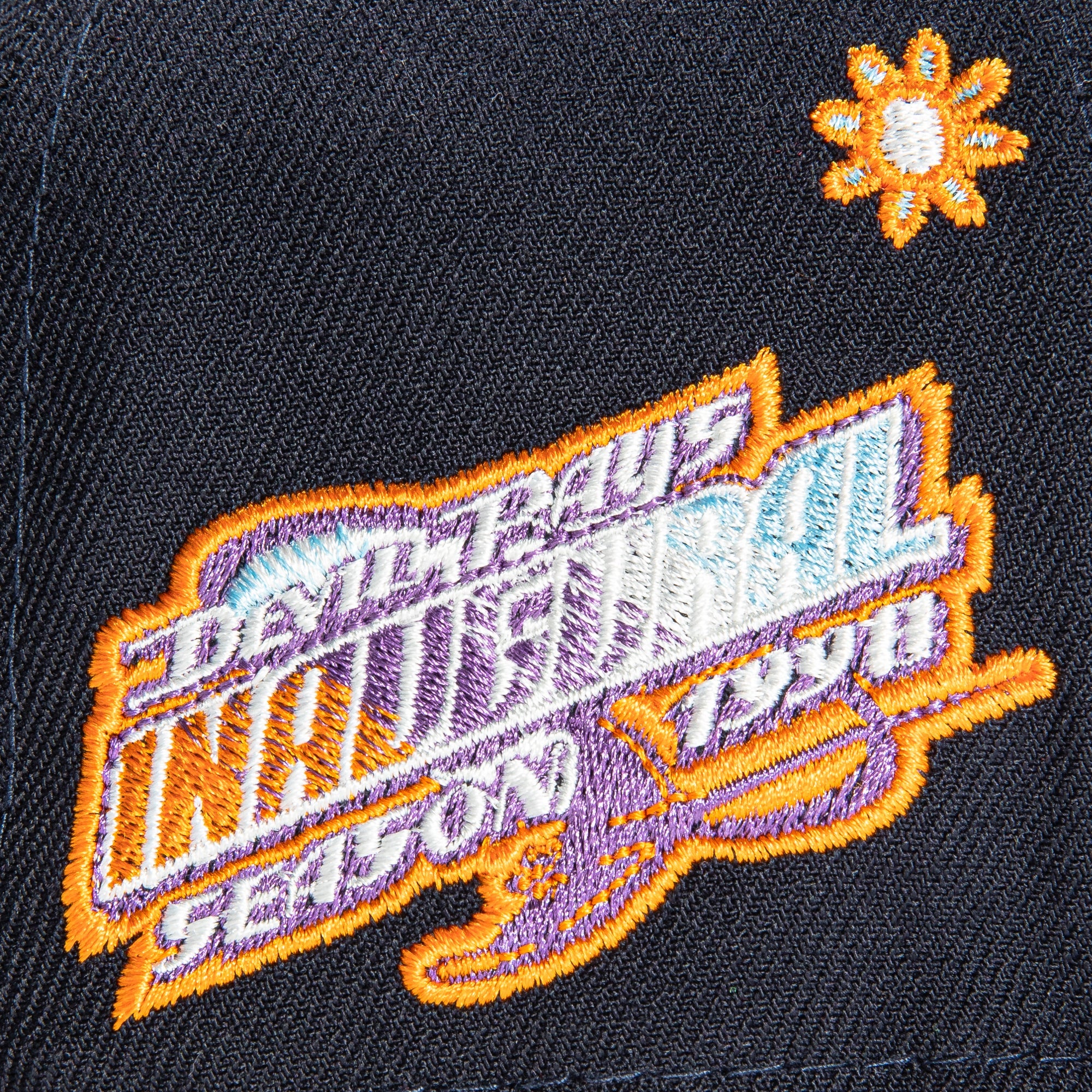 This New Era Super Bloom Tampa Bay Rays Inaugural 2022 59FIFTY Fitted Hat is a Hat Club exclusive. It has a navy six panel structured high crown and embroidered eyelets with a navy fabric squatchee button. The fitted cap has a navy flat bill with a orange undervisor. The front panel features the Tampa Bay Rays logo embroidery and a Inaugural Season side patch embroidery on the right panel. The left panel of the fitted displays the New Era logo and the official MLB logo embroidery on the rear crown.