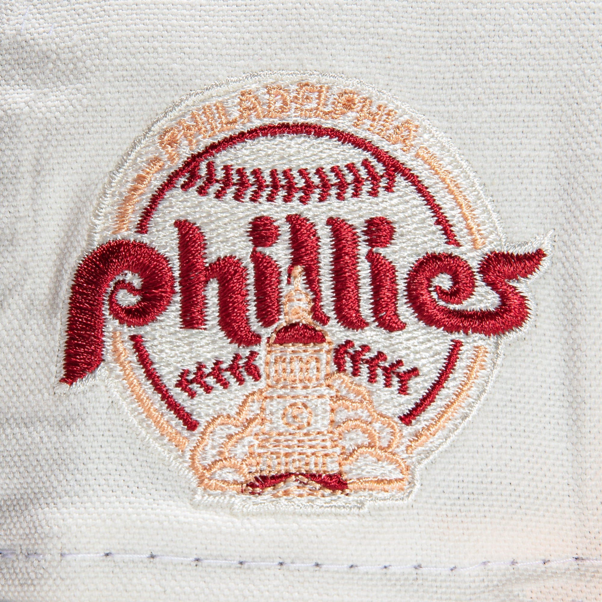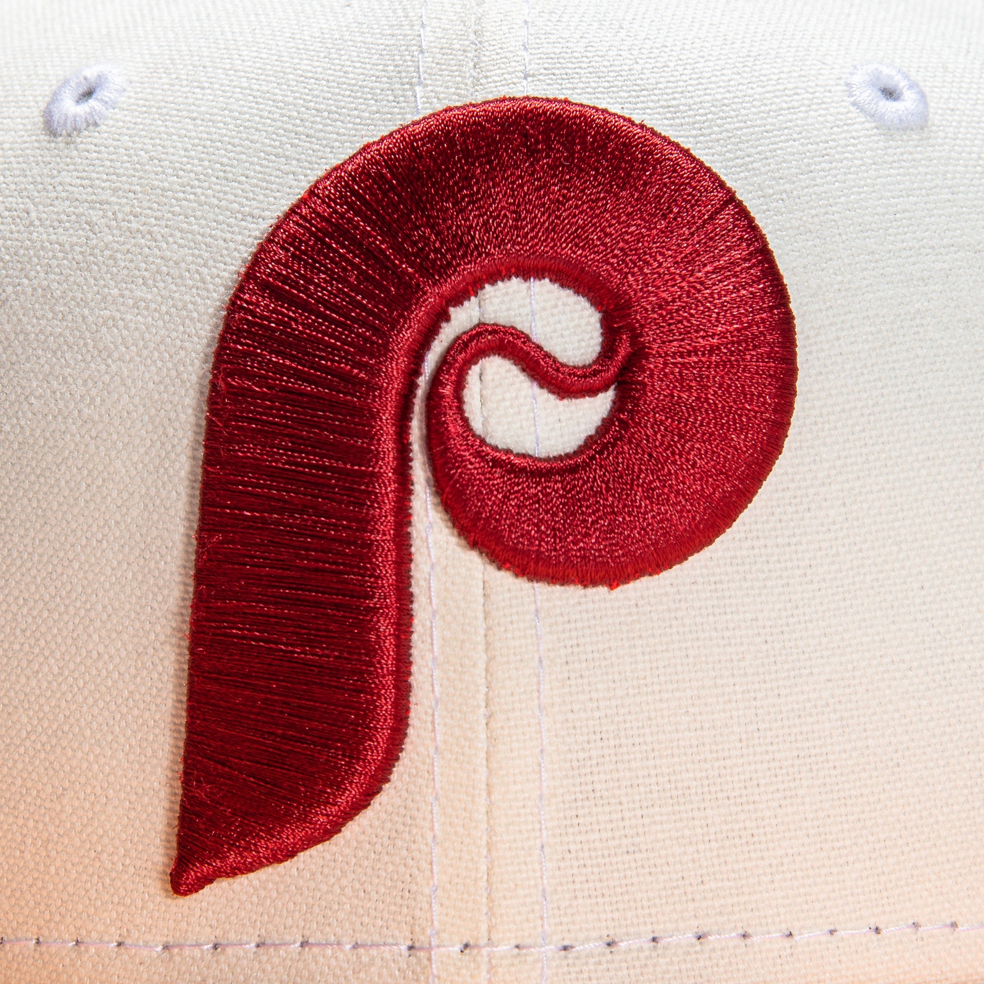 This New Era Monaco Philadelphia Phillies 1982 Logo 59FIFTY Fitted Hat is a Hat Club exclusive. The fitted has a stone six panel structured high crown and embroidered eyelets with a peach fabric squatchee button. The fitted cap also has a peach flat bill with a maroon satin undervisor. The front panel features the Philadelphia Phillies logo embroidery and a 1982 team logo side patch embroidery on the right panel. The left panel of the fitted displays the New Era logo and the official MLB logo embroidery on the rear crown.