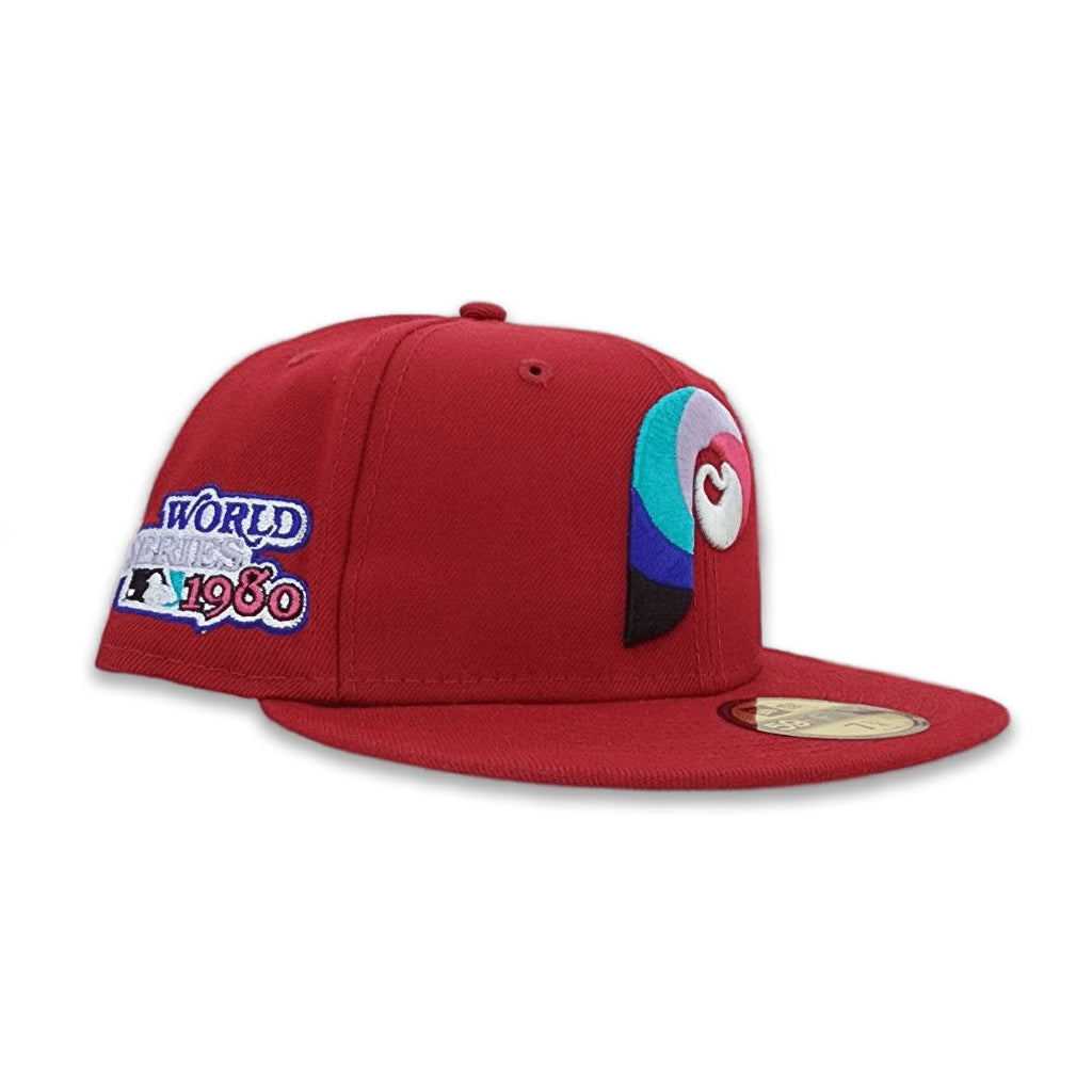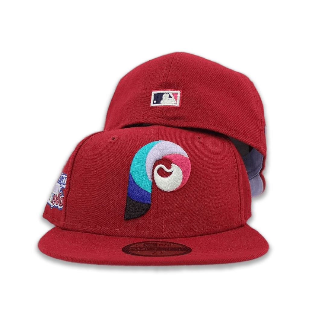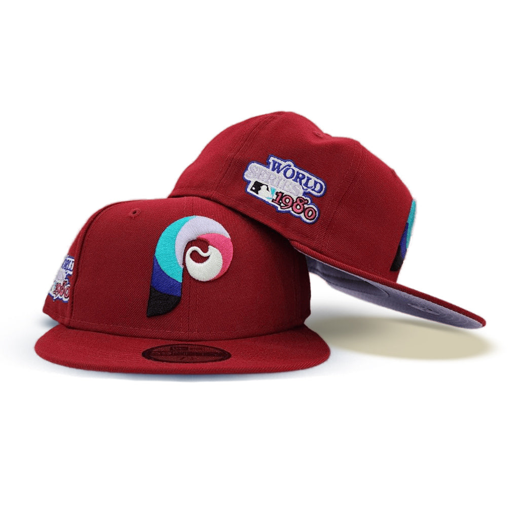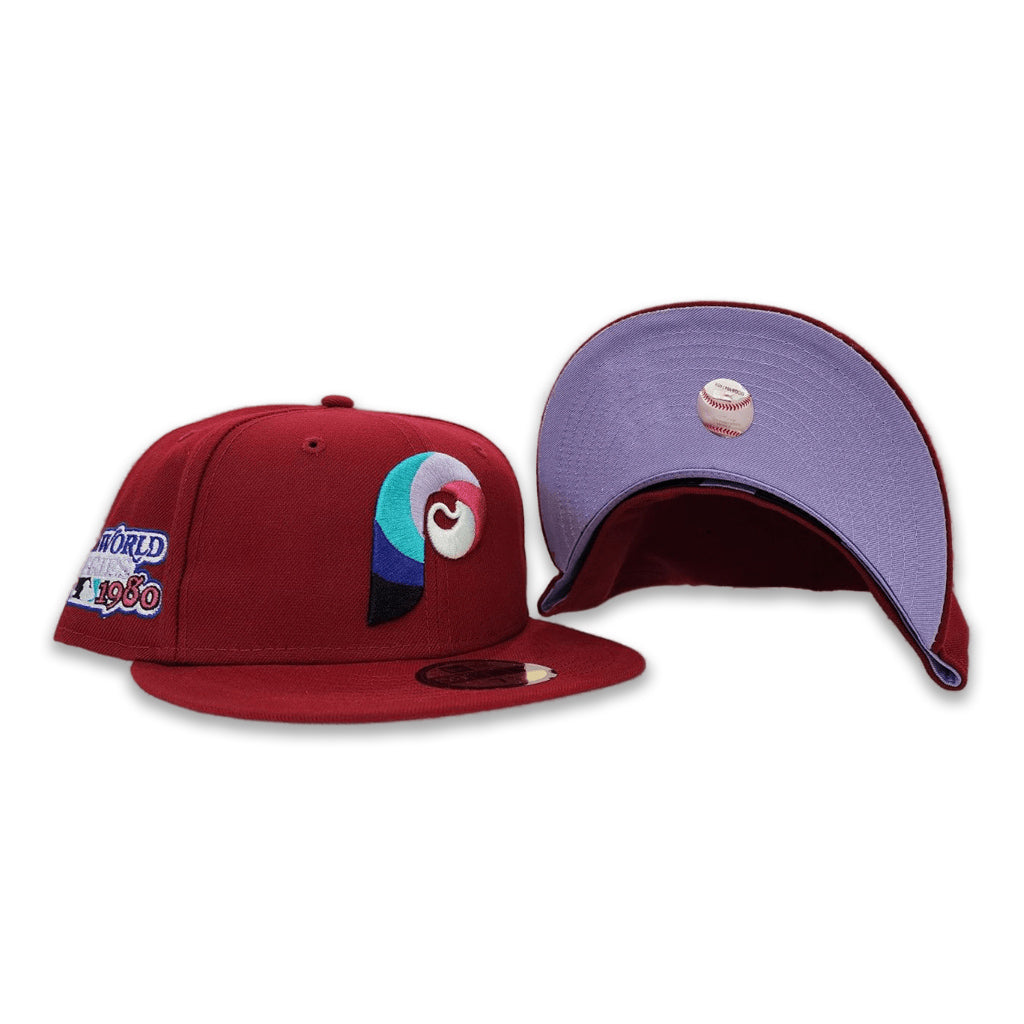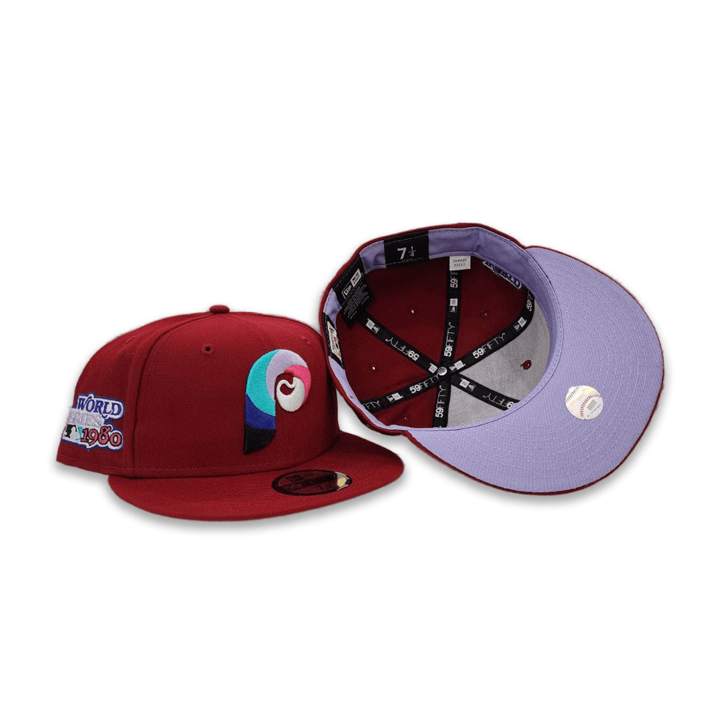 This New Era Polar Lights Black Philadelphia Phillies Lavender Bottom 1980 World Series Side Patch 59FIFTY Fitted Hat was released by Exclusive Fitted. The fitted has a cardinal red six panel structured high crown and embroidered eyelets with a cardinal red fabric squatchee button. The fitted cap also has a cardinal red flat bill with a lavender undervisor. The front panel features the Philadelphia Phillies logo embroidery and a 1980 World Series side patch embroidery on the right panel. The left panel of the fitted displays the New Era logo and the official MLB logo embroidery on the rear crown.