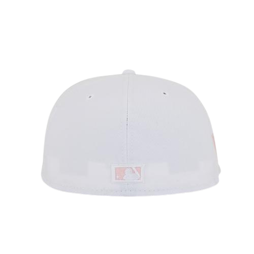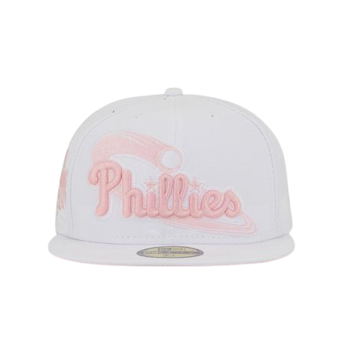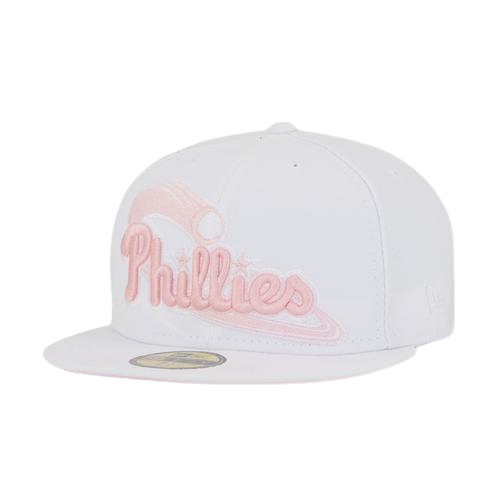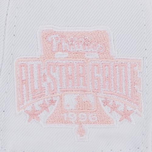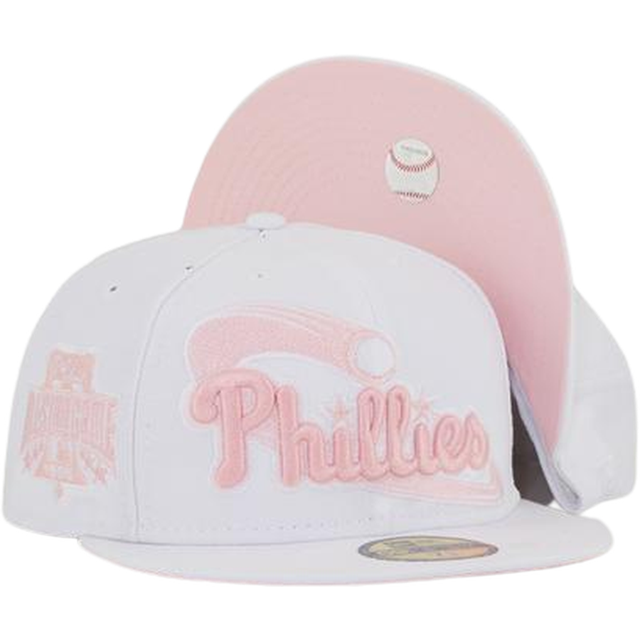 This New Era Philadelphia Phillies White "Brotherly Love" Pink Undervisor 59FIFTY Fitted Hat has a white six panel structured high crown and embroidered eyelets with a white fabric squatchee button. The fitted cap has a white flat bill with a pink undervisor. The front panel features the Philadelphia Phillies logo embroidery and a 1996 ASG side patch embroidery on the right panel. The left panel of the fitted displays the New Era logo and the official MLB logo embroidery on the rear crown.