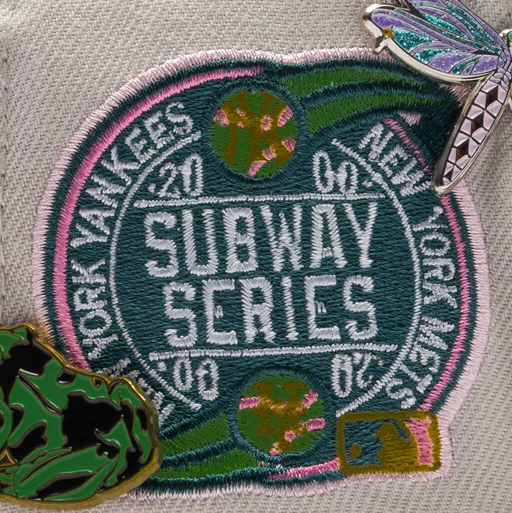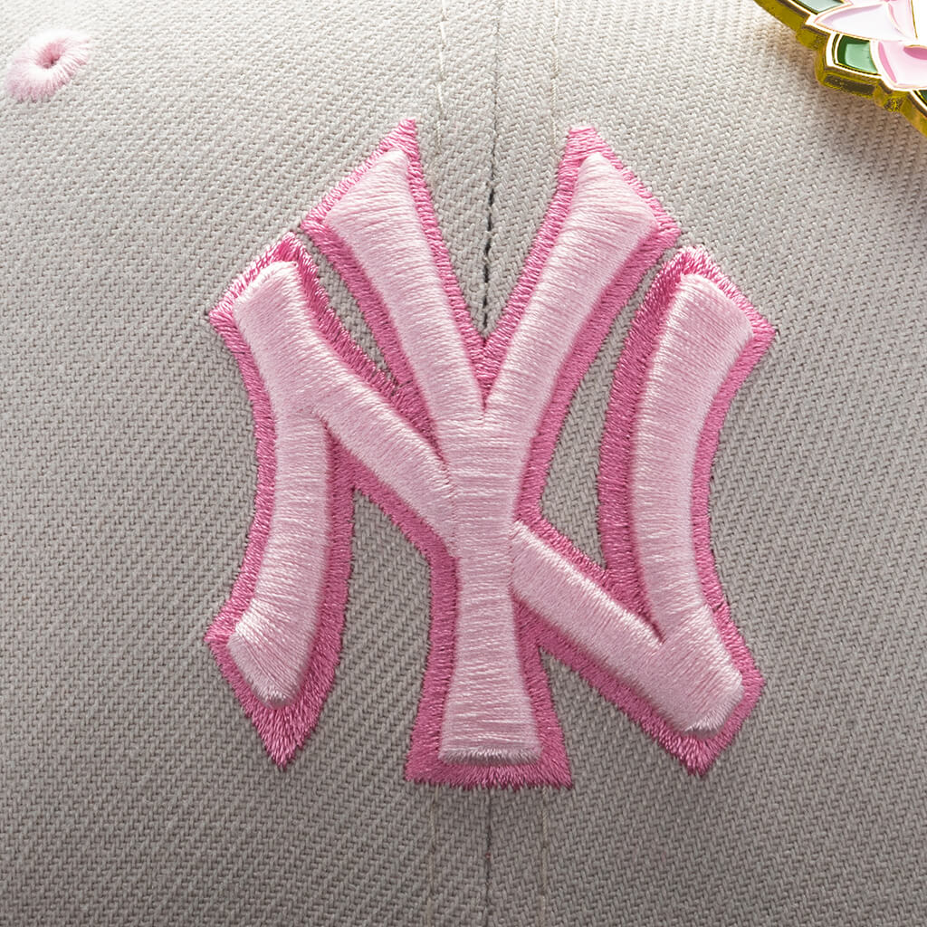 This New York Yankees 59FIFTY fitted hat was released by Feature . The fitted has stone gray six panel structured high crown and embroidered eyelets, with a black flat brim and fabric squatchee button. The fitted also has a pink bottom undervisor and black sweatband. The front panel features the New York Yankees logo embroidered in pink threads in similar shade of the lotus flower, with a Subway Series side patch on the right panel. The left panel of the fitted displays the New Era logo and the official MLB Batterman embroidery on the rear crown.
