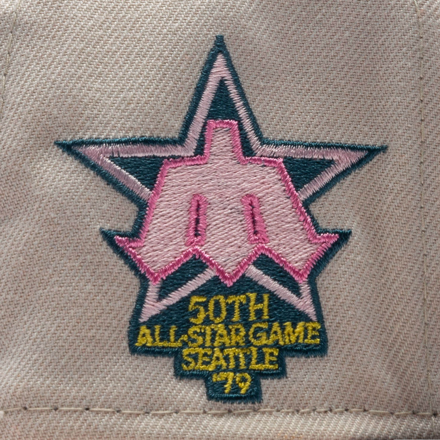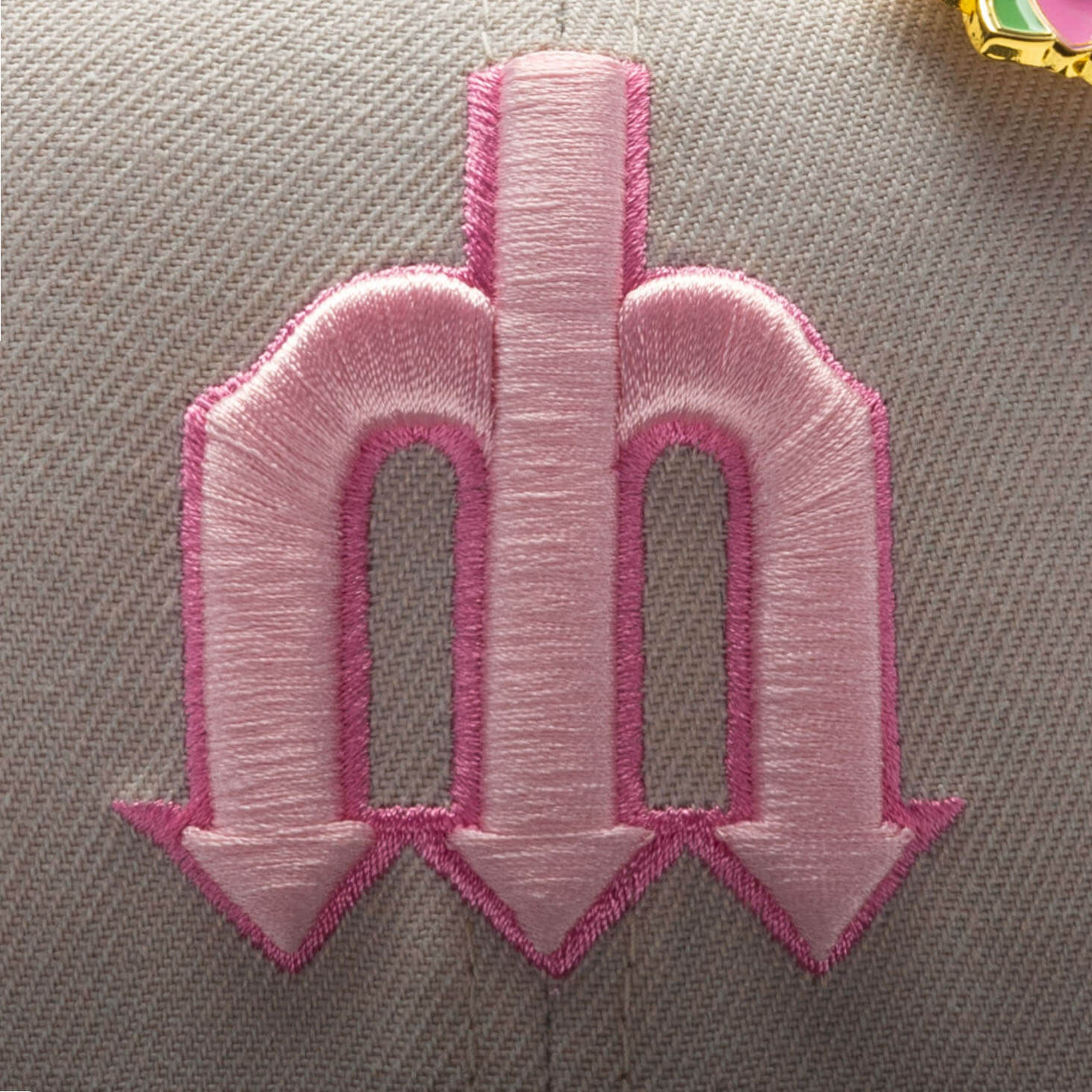 . The fitted has stone gray six panel structured high crown and embroidered eyelets, with a black flat brim and fabric squatchee button. The fitted also has a pink bottom undervisor and black sweatband. The front panel features the Seattle Mariners logo embroidered in pink threads in similar shade of the lotus flower, with a side patch on the right panel. The left panel of the fitted displays the New Era logo and the official MLB Batterman embroidery on the rear crown.