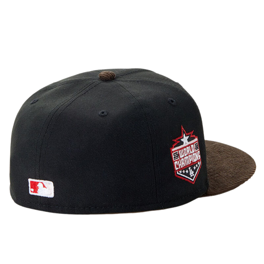 This Los Angeles Dodgers fitted hat was released by PacSun. The fitted has a black six panel structured high crown and embroidered eyelets with a walnut brown corduroy fabric squatchee button. The fitted cap also has a walnut brown corduroy flat bill with a soft pink undervisor and white sweatband. The front panel features the Los Angeles Dodgers logo embroidery and a World Champions side patch on the right panel. The left panel of the fitted displays the New Era logo and the official MLB Batterman logo embroidery on the rear crown.