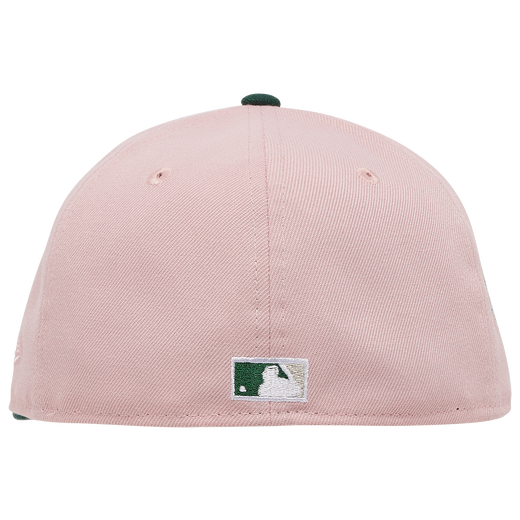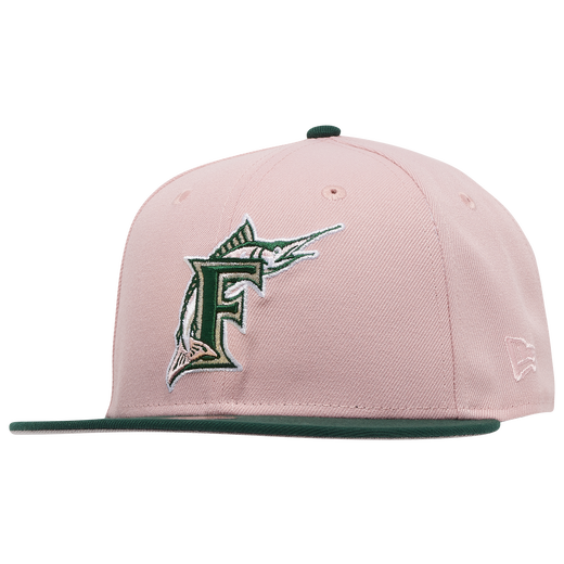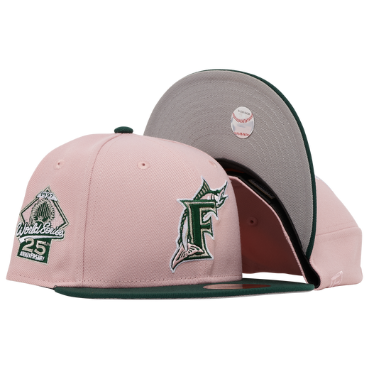 This New Era Florida Marlins 59FIFTY fitted hat is a Champs Sports exclusive release. The fitted has a blush pink six panel structured high crown and embroidered eyelets with a dark green fabric squatchee button and flat visor. The fitted also has a grey bottom undervisor. The front panel features the Florida Marlins logo embroidered in dark green stitching with a dual 1997 World Series & 25th Anniversary side patch on the right panel.