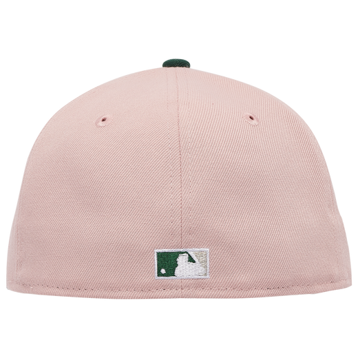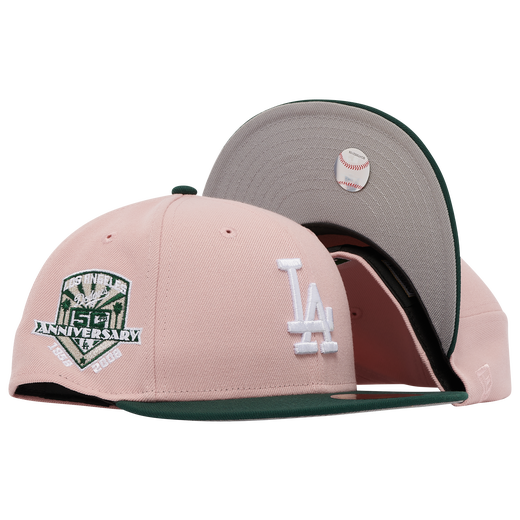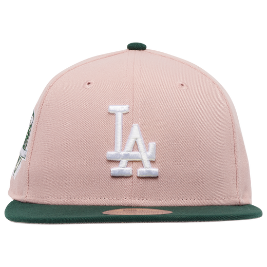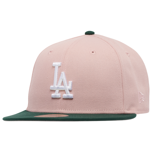This New Era Los Angeles Dodgers 59FIFTY fitted hat is a Champs Sports exclusive release. The fitted has a blush pink six panel structured high crown and embroidered eyelets with a dark green fabric squatchee button and flat visor. The fitted also has a grey bottom undervisor. The front panel features the Los Angeles Dodgers logo embroidered in white stitching with a 50th Anniversary side patch on the right panel.