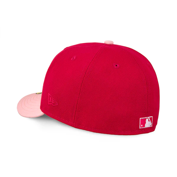 This New Era New York Yankees 59FIFTY fitted hat was released by Cap USA. The fitted has a beetroot six panel structured high crown and embroidered eyelets with a soft pink fabric squatchee button and bill. The front panel features the New York Yankees logo embroidered in white stitching and a world series side patch on the right panel.