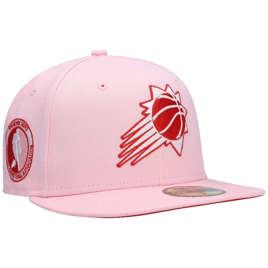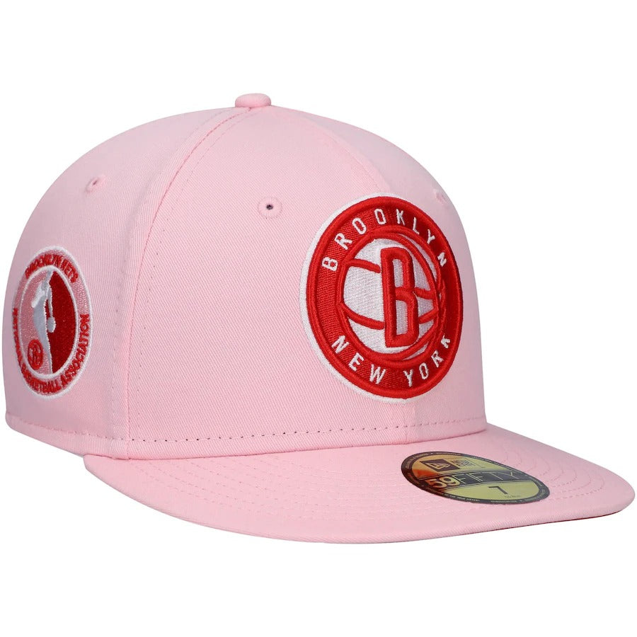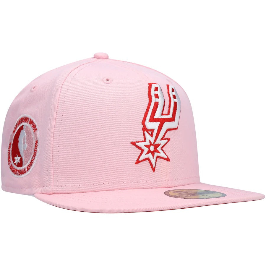 This New Era 59FIFTY NBA Candy Cane fitted hat collection has a pink and red colorway. The structured six panel high crown, embroidered eyelets and fabric squatchee button are pink. The flat bill of the fitted cap is also pink with a red bottom undervisor. The NBA teams logo are also embroidered in red thread on the front and right panel as well as the New Era logo on the left panel.