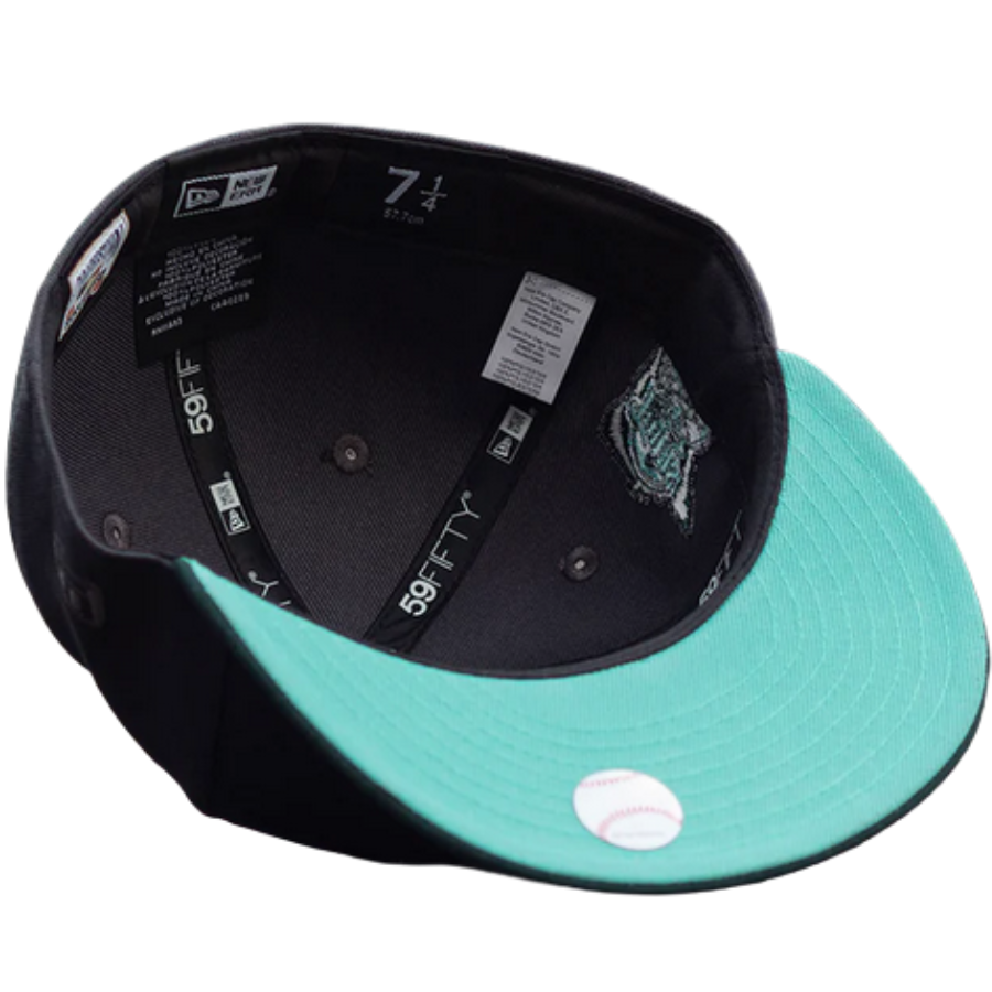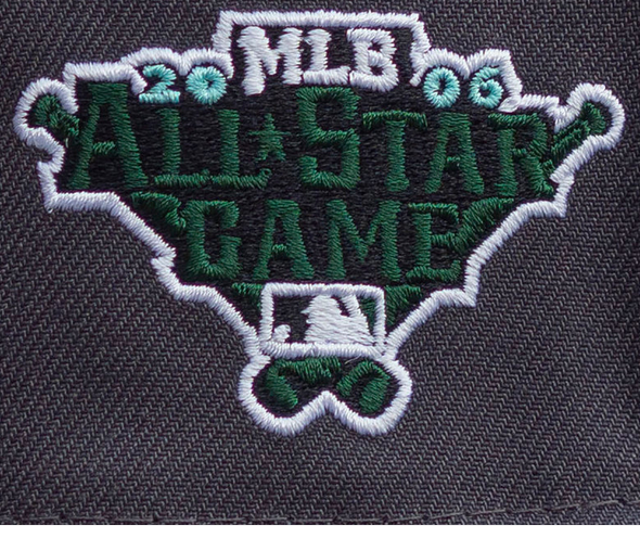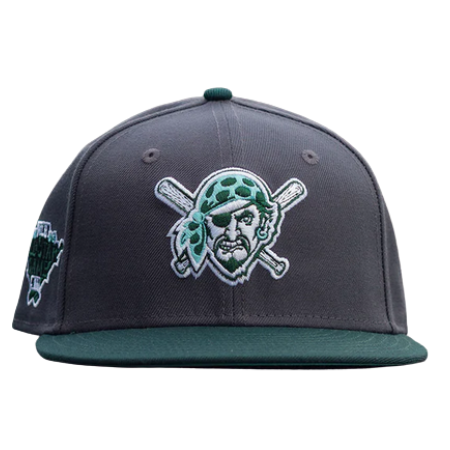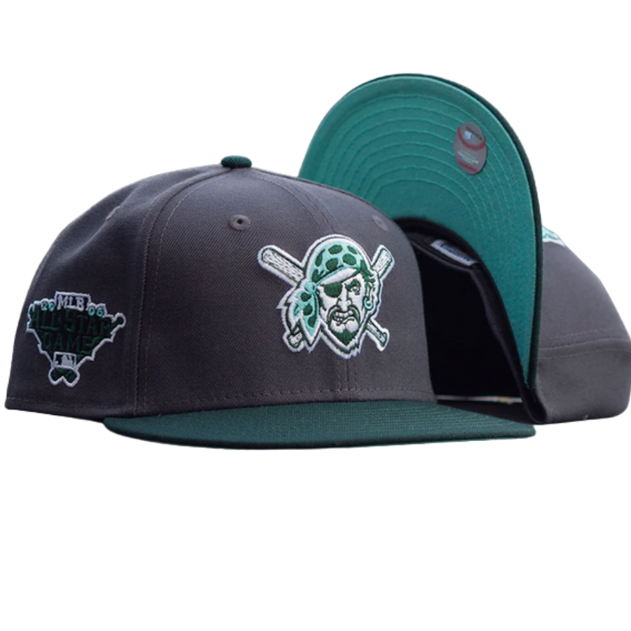 This New Era Pittsburgh Pirates 2006 All-Star Games Clear Mint Undervisor Fitted Cap has a graphite six panel structured high crown and embroidered eyelets with a dark green fabric squatchee button and flat bill. The undervisor of the fitted is clear mint with a black sweatband. The right panel features 2006 ASG embroidered patch.