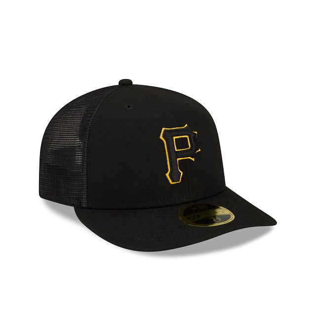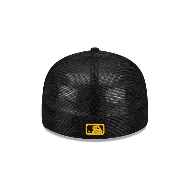 The Pittsburgh Pirates 2023 Batting Practice Low Profile 59FIFTY Fitted Cap features an embroidered Pirates logo at the front panels with a matching MLB Batterman logo at the rear and a gray undervisor.